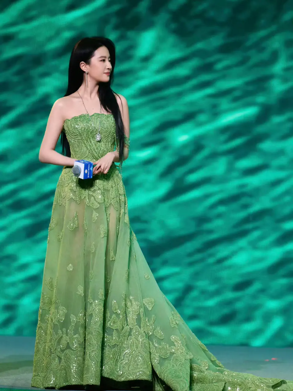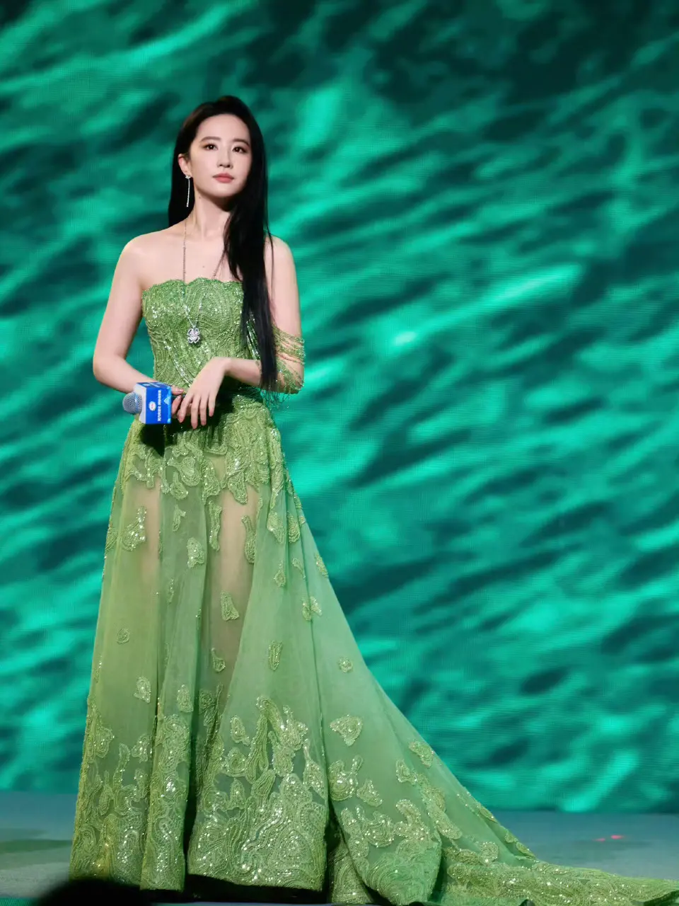 来一组刘亦菲的绿色晚礼服美照 和后面的背景非常协调