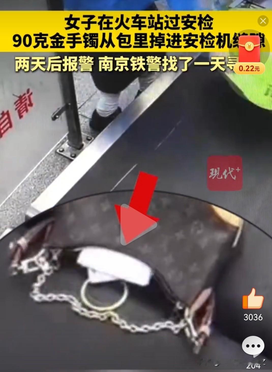 看见南京站这出金镯子“失而复得”的戏码 我真的要爆炸了 谁给我个保洁阿姨的电话?我真的很想问她,捡到金镯子那会儿,手有没有抖? 陈女士10月5号过安检没拉包,90克的金镯子滑进安检机缝里,7号报警,民警调监控查了两天,8号凌晨才发现保洁阿姨弯腰捡的画面,换谁丢了这么重的金镯子不得急疯? 保洁阿姨捡到镯子没藏着掖着,在附近问了一圈没人认领,就自己收着等广播,10月8号民警一找她,立刻就还了,现在这世道,捡到金镯子还能这么实诚的人,上哪儿找去? 你说现在总有人说世风日下,可这金镯子的事儿,不就明摆着还是好人多吗?