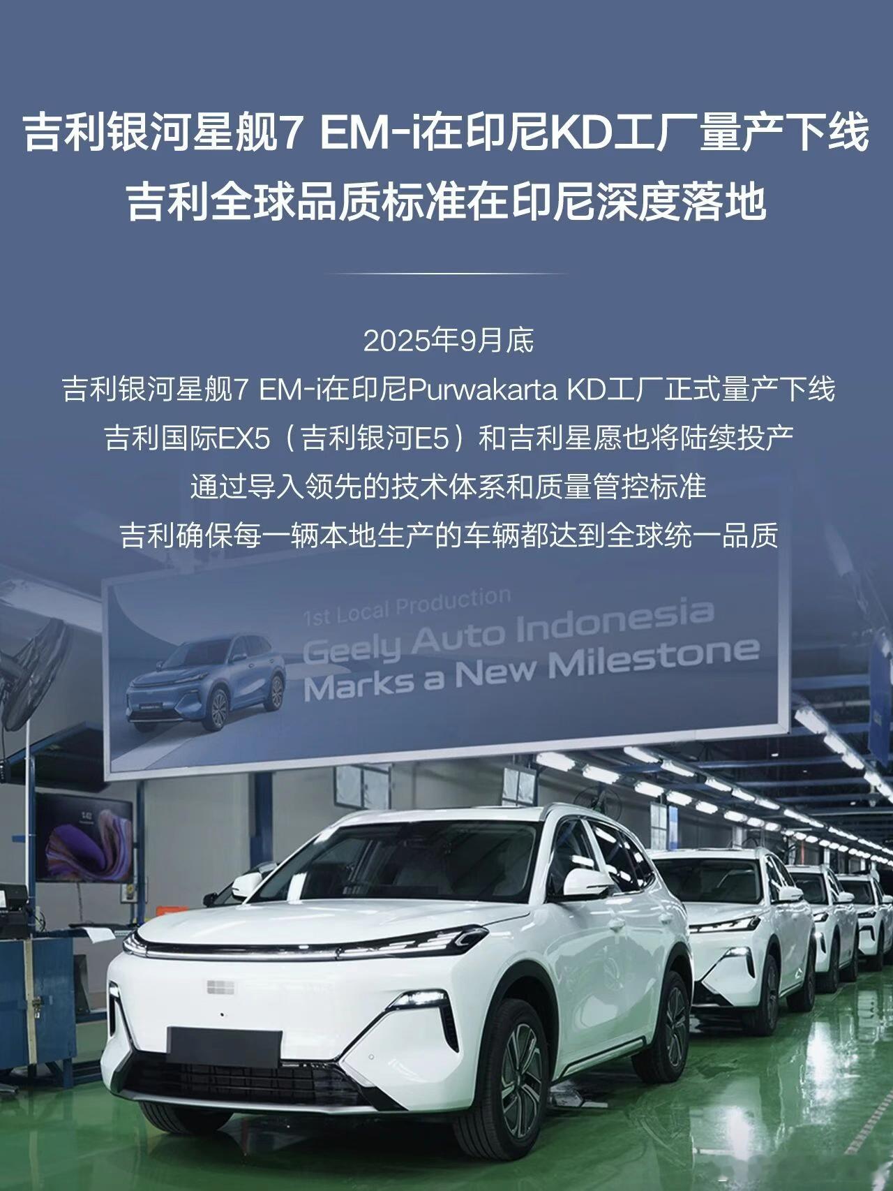 吉利银河星舰7 EM-i在印尼KD工厂正式量产下线。吉利始终以领先的技术体系和质量管控标准,让生产的每一款产品都保持吉利全球一致的高标准、高水平、高品质。
