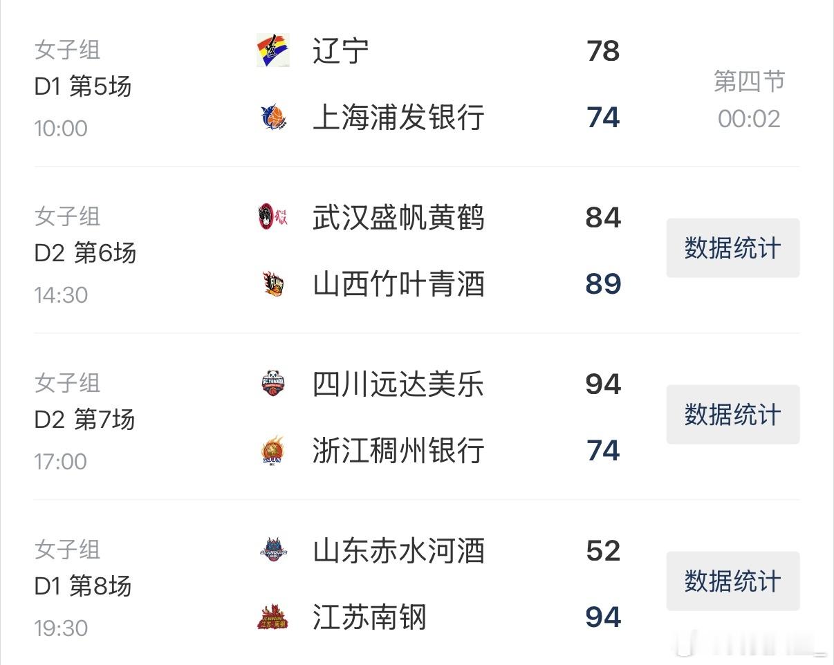 辽宁 78-74 上海浦发银行,辽宁队的吴爽砍下全场最高的24分,胡玥明和李雨萌分别贡献19分和10分,付金秋打出9分11篮板的准两双数据。上海队三人得分上双,其中周钰妍贡献11分11篮板,黄靖和刘禹彤分别贡献17分和14分。