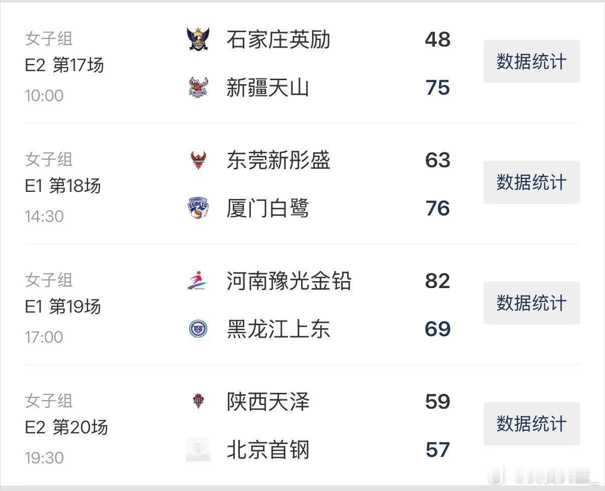 石家庄英励 48-75 新疆天山,河北队仅两人得分上双,沈琳淇和兰彬宁分别得到13分和10分。新疆队三人得分上双热苏拉·阿布都克力木、吴熠璠和张慈源分别贡献16分,12分和10分。