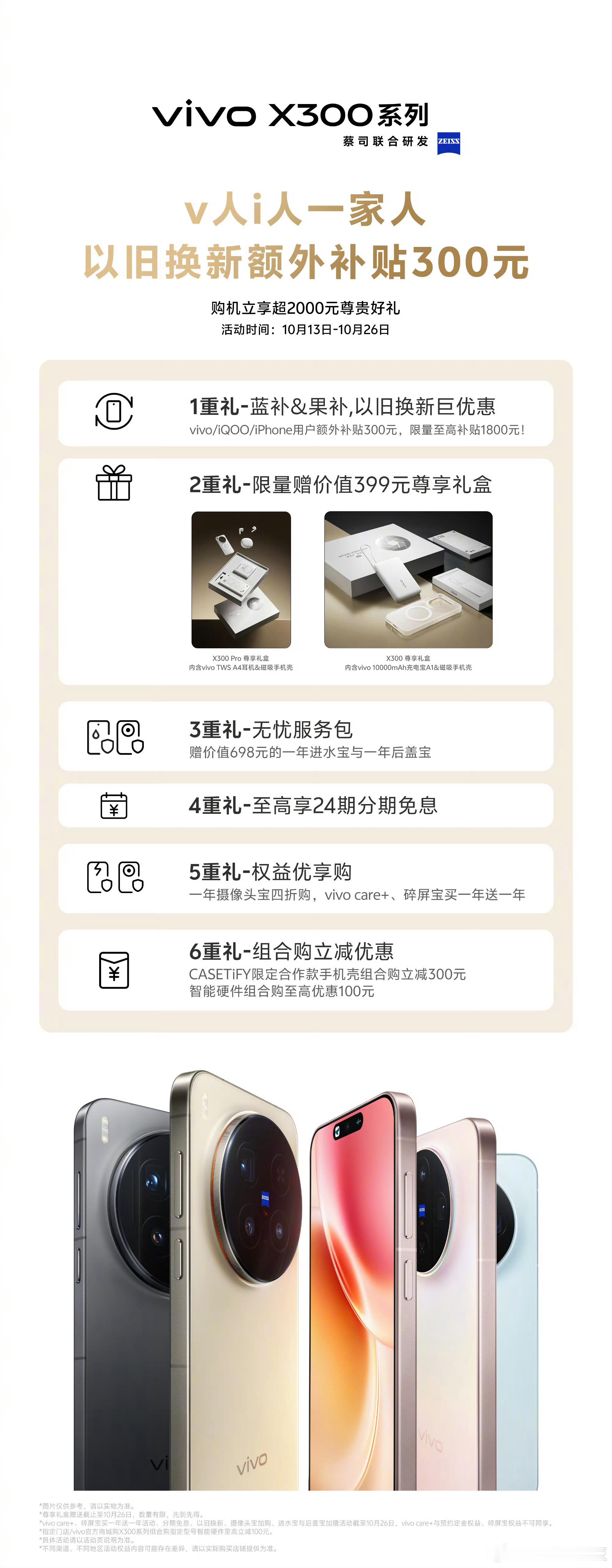 老用户换vivoX300值得吗这次X300系列真的戳中所有期待点!vivo X300 4399元起,vivo X300 Pro 5299元起。老用户以旧换新至高补1800元,再叠24期分期免息,新机入手几乎没压力。机子本身才叫惊艳,190g轻薄机身握感超舒服;蔡司联合研发的影像系统,2亿像素长焦拍啥都清晰;天玑9500芯片+OriginOS 6系统,流畅度拉满!现在已经开预售,10月17日正式开售,早订早拿到手![酷]