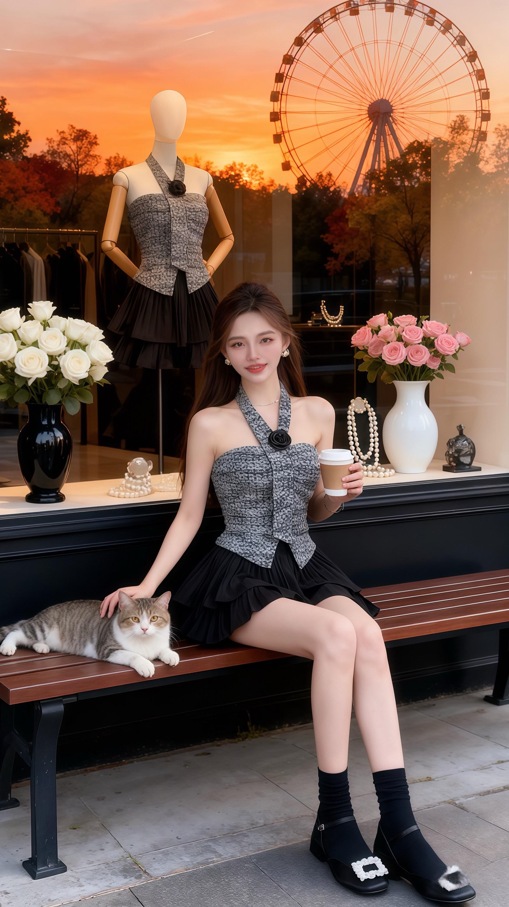 第一次在长椅上偶遇那只狸花猫时,她正捧着咖啡,珍珠扣饰的黑皮鞋在光影里闪着温柔的光。后来拎着黑包在路口回眸,晚风掀起裙摆,摩天轮在暮色里缓缓转动,她才发现,原来自己早已成了这条街最灵动的风景,把秋日的浪漫与时尚,都穿成了独属于自己的故事。