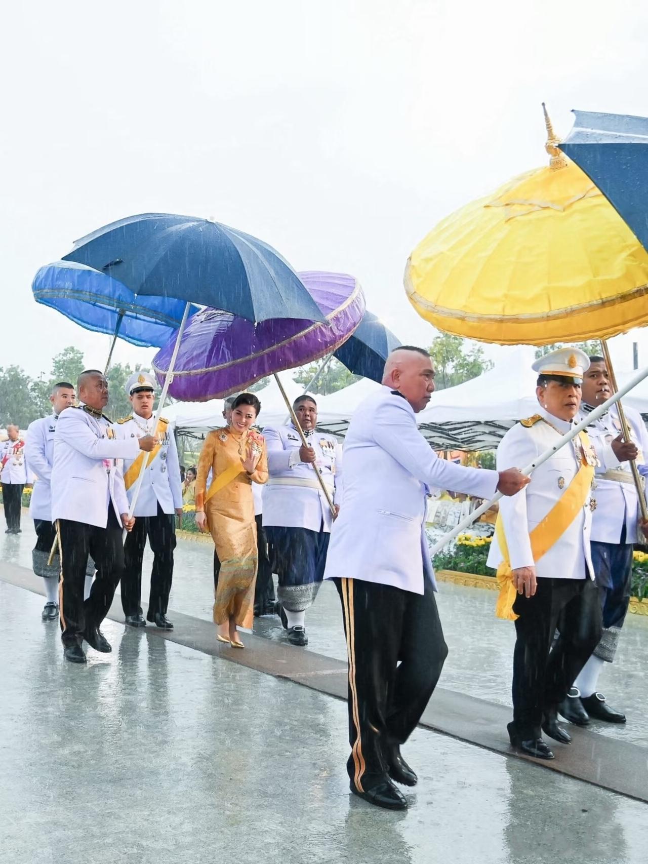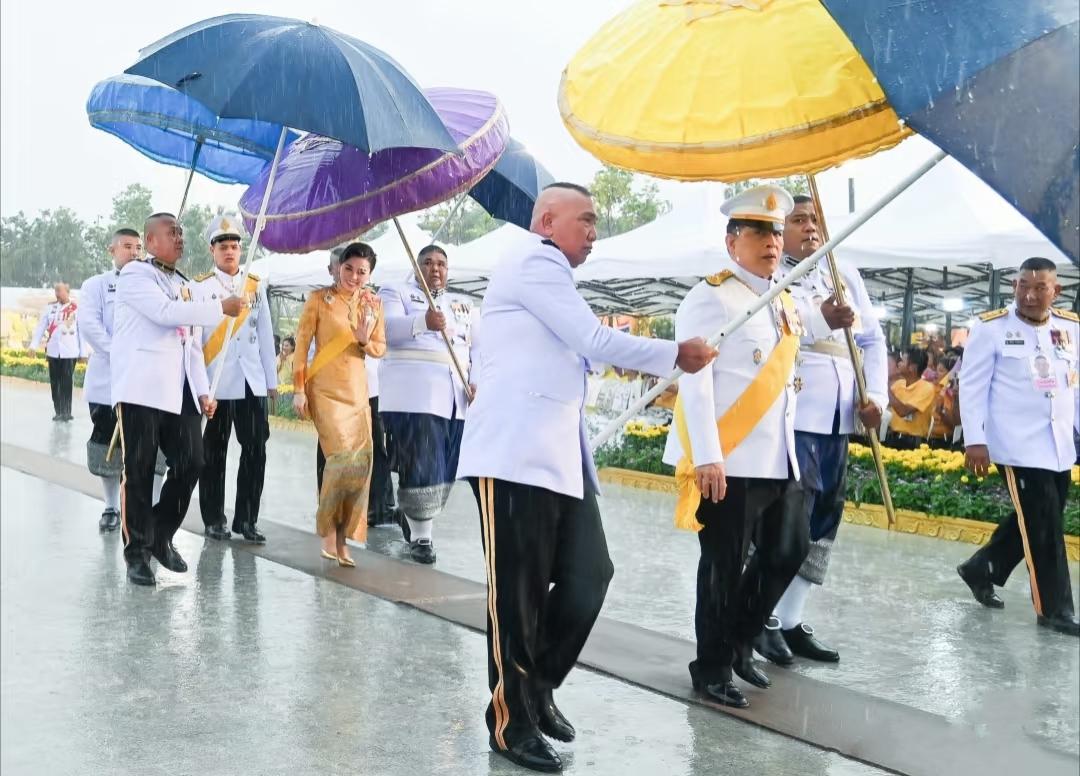 10月13日,苏提达王后和老公玛哈国王在雨中出席活动,苏提达王后依然笑容甜美。