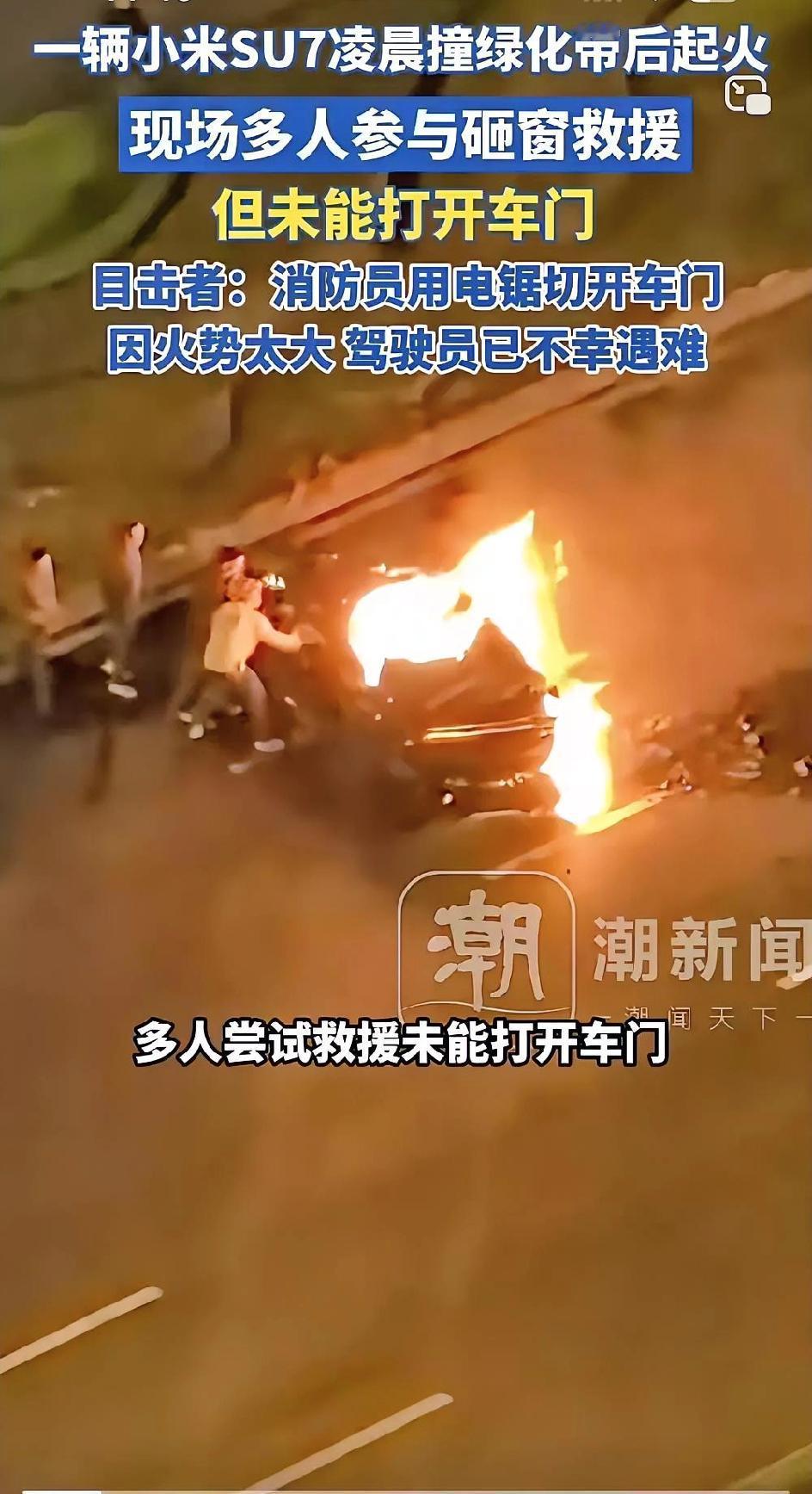 一辆崭新轿车撞上绿化带瞬间变成火球 路人拼命拉扯车门却纹丝不动 最终消防锯开门只