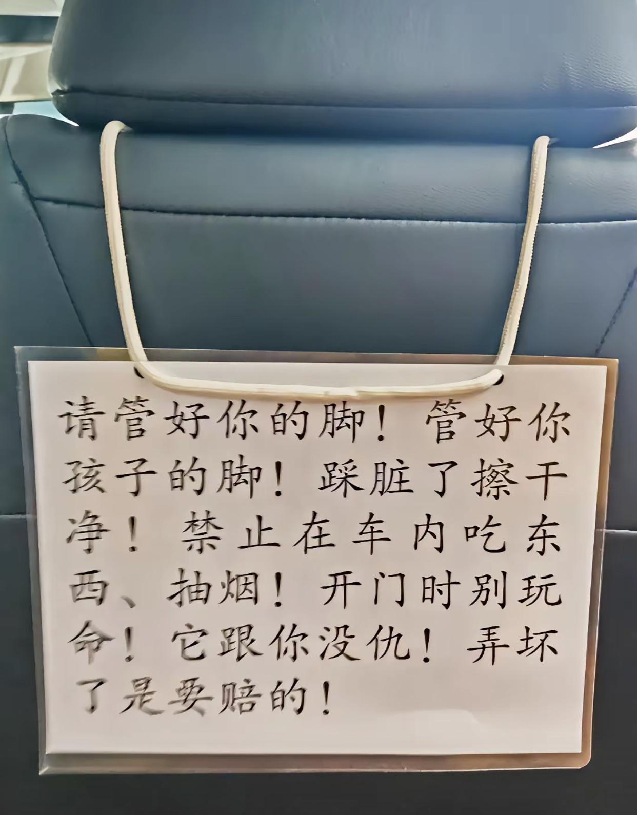 看到这一则“爱车守则”,坐在车里面,你的心情会很舒服吗?这好像在教训每一名乘客,更别说什么体验感了。 怎么说呢,我能理解 作为一名网约车,特别是做顺风车司机,的确会遇到很多乘客下车大力关门,喜欢把鞋子顶在前排座位,喜欢车里吃东西,怎么舒服怎么来。 能理解车主,毕竟爱车心切嘛,乘客行为不当才出如此下策, 只是这种表达方式确实容易让人有距离感,你挂着这个牌子,想拿个好评都难。换另外一种语气,柔和点的吧,这样,你的生意不会好到哪里去。