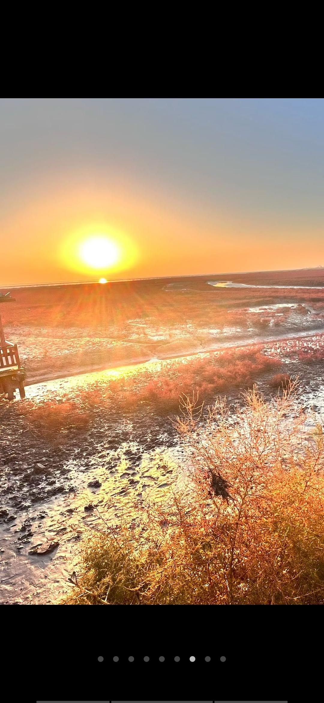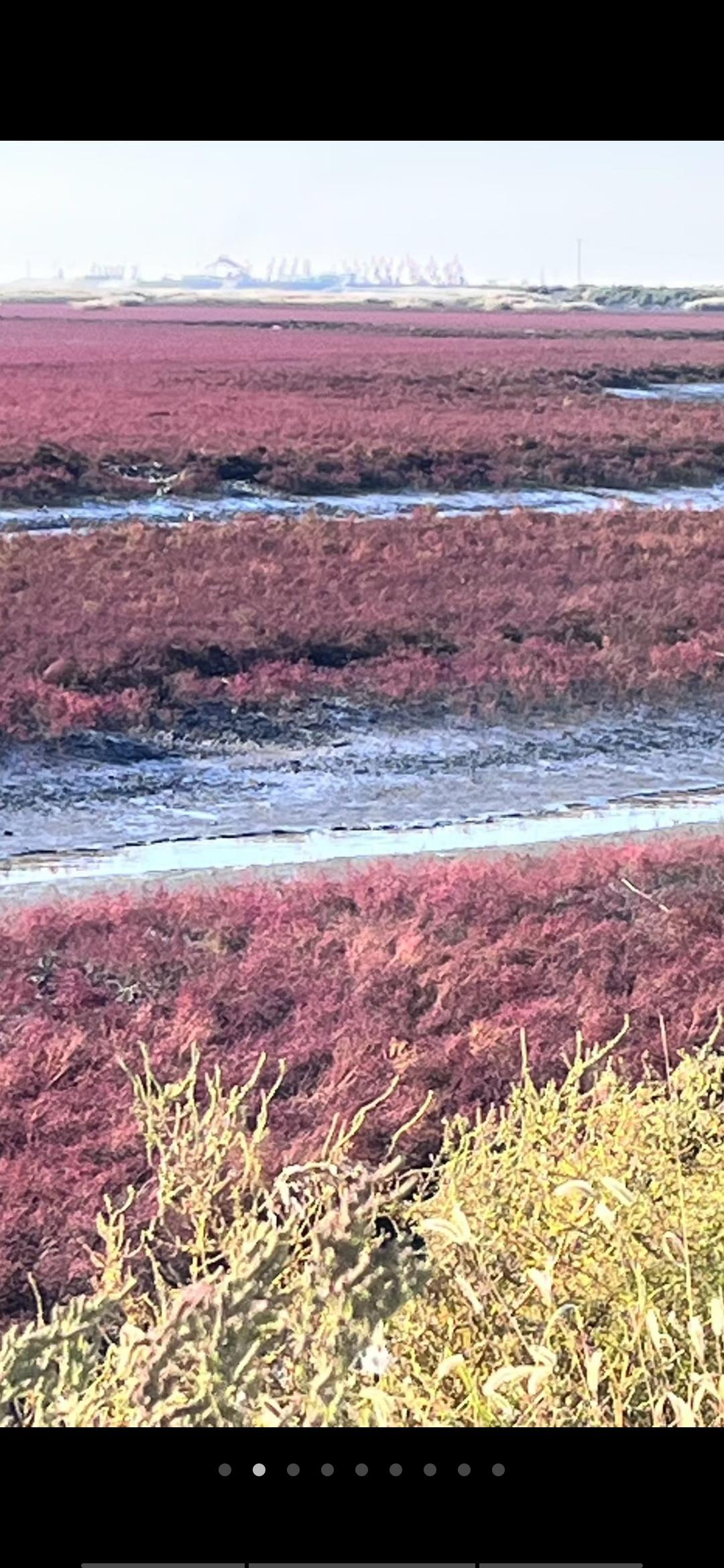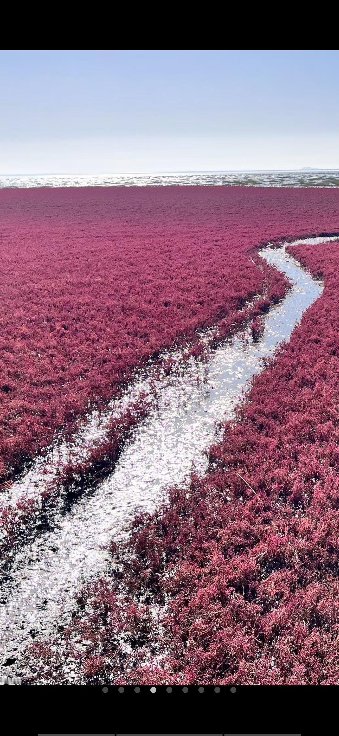 盘锦红海滩的碱蓬草现在是最成熟、颜色最鲜艳的时节,远远望去,像是由一颗颗纤弱碱蓬