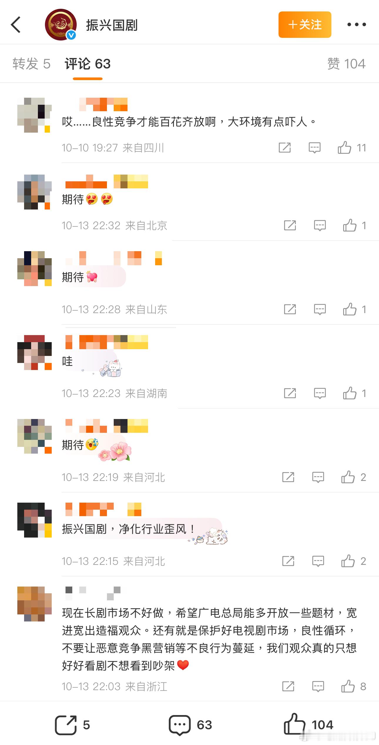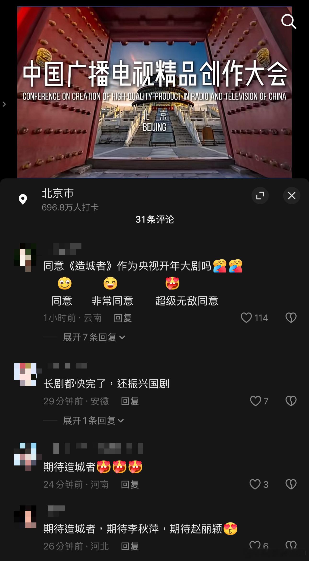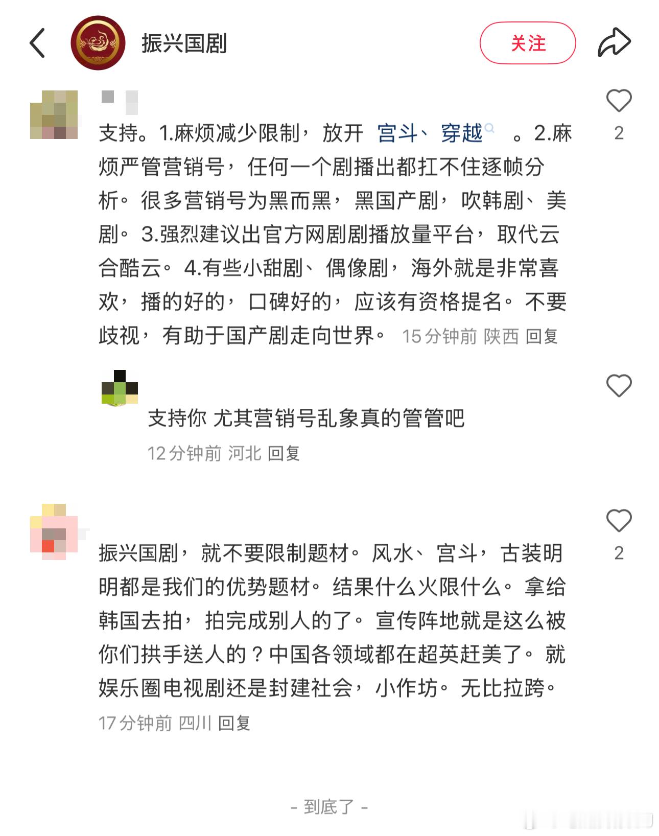 其它各平台都是刚开始运营,截了🧣/🍠/🎶非剧宣内容的评论区(B站没评论所以跳过),目前是微博这边最活跃,大家对国剧还是有一定想法和期待的,也都提到了可以解除题材限制让创作百花齐放。