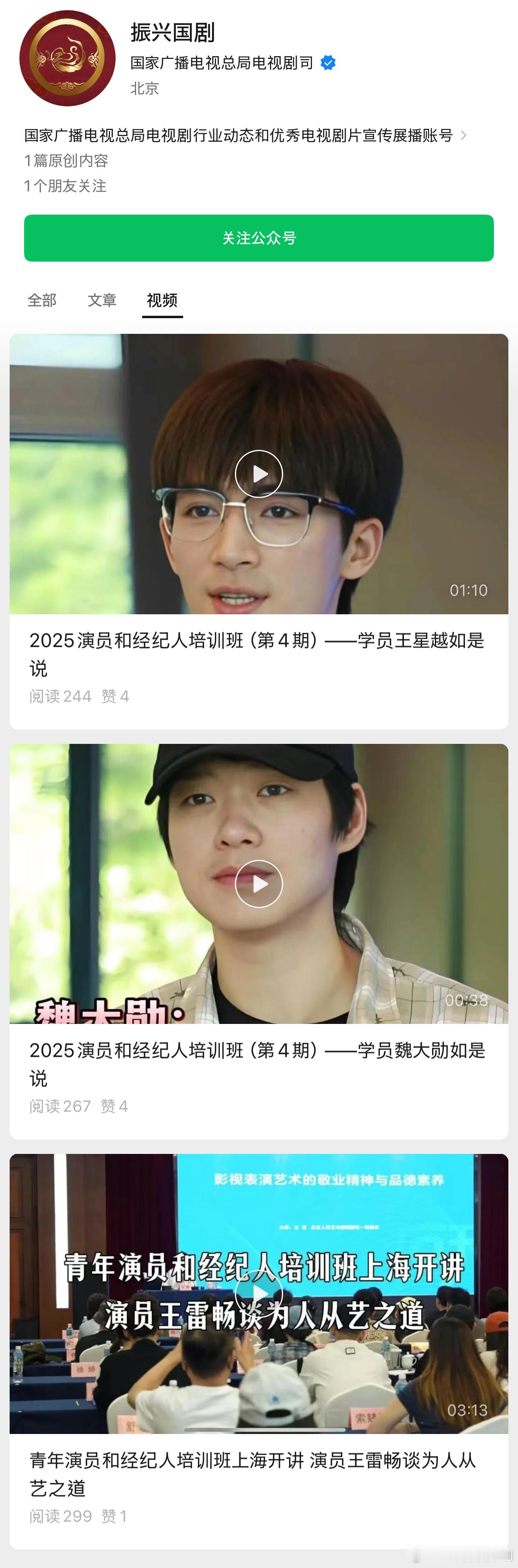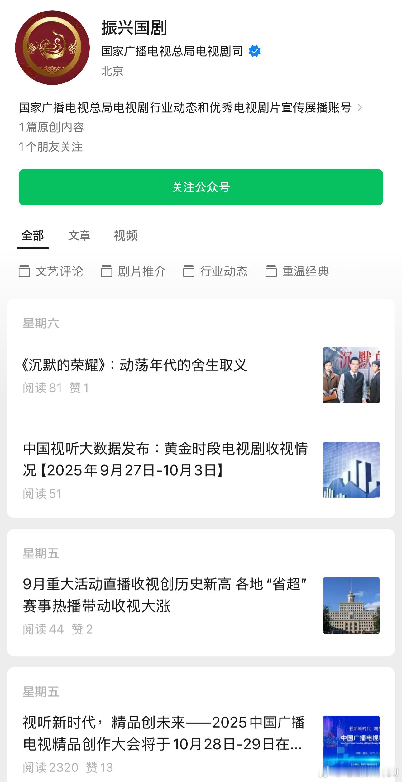 看了下公号内容最多,从今年7月精品剧集青年创作人才培训班活动开始更新,也有一些剧评和重点项目宣传。