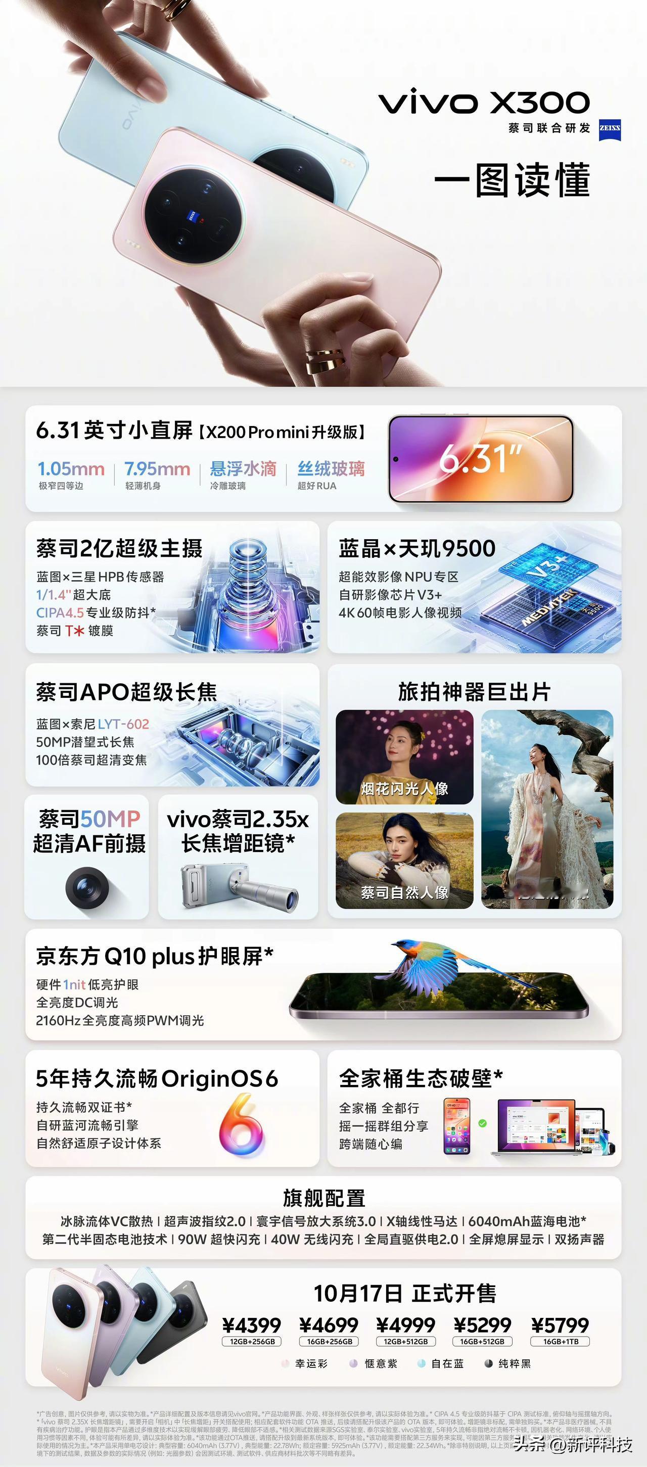 X300系列正式发布: 性能上与联发科技共同定义蓝晶×天玑9500,搭载蓝图影像芯片V3+。 电池上搭载第四代硅碳负极,第二代半固态电池技术,-20°严寒中仍能正常使用,X300 6040mAh,X300 Pro 6510mAh,90W充电+40W无线充电。 屏幕上搭载京东方Q10Plus护眼屏,8T LTPO,支持全亮度2160Hz 高频PWM调光、全亮度DC调光、双Demura优化、硬件1nit极暗屏。 vivo X300为6.31英寸屏幕,7.95mm厚,190g重,2亿主摄HPB、APO长焦、5000万AF前摄。全新蔡司自然人像,全焦段运动人像抓拍。支持4K高清视频转Live格式,能直接发小红书。 vivo X300 Pro为6.78英寸大屏,7.99mm厚,主摄LYT-828,蔡司2亿APO超级长焦HPB,舞台模式全新双视野录像,X300 Pro加蔡司长焦增距镜,演唱会、动物园神器。支持4K 120fps 杜比视界拍摄,首发剪映4K 120fps杜比视界编辑导出能力;4K 120fps 10bit Log视频,同时支持主摄、长焦和长焦增距镜;4K 60fps电影人像。 售价: vivo X300 12GB+256GB 4399元 12GB+512GB 4699元 16GB+256GB 4999元 16GB+512GB 5299元 16GB+1TB 5799元 vivo X300 Pro 12GB+256GB 5299元 16GB+512GB 5999元 16GB+1TB 6499元 16GB+1TB影像套装(卫星通信版)8299元