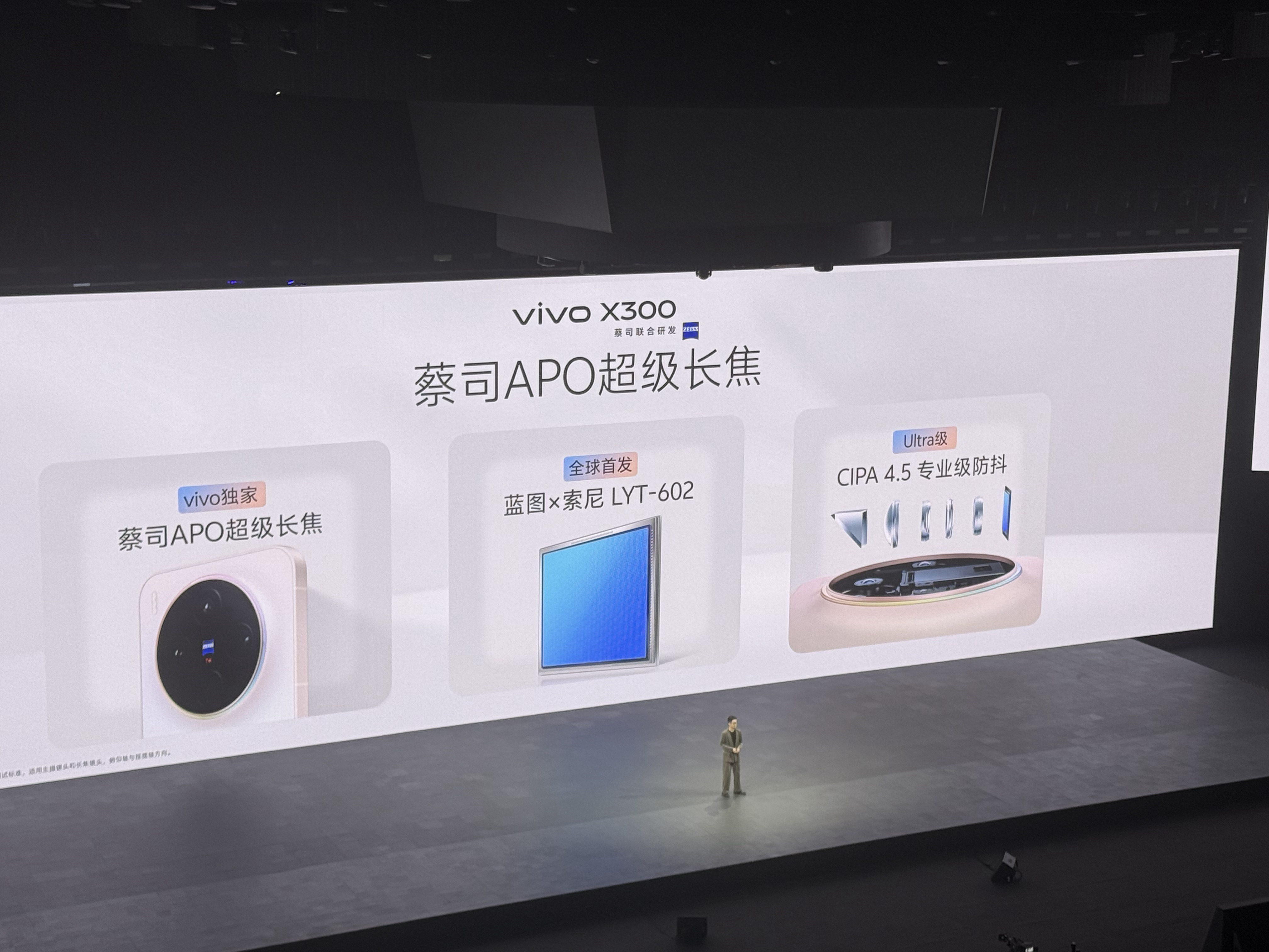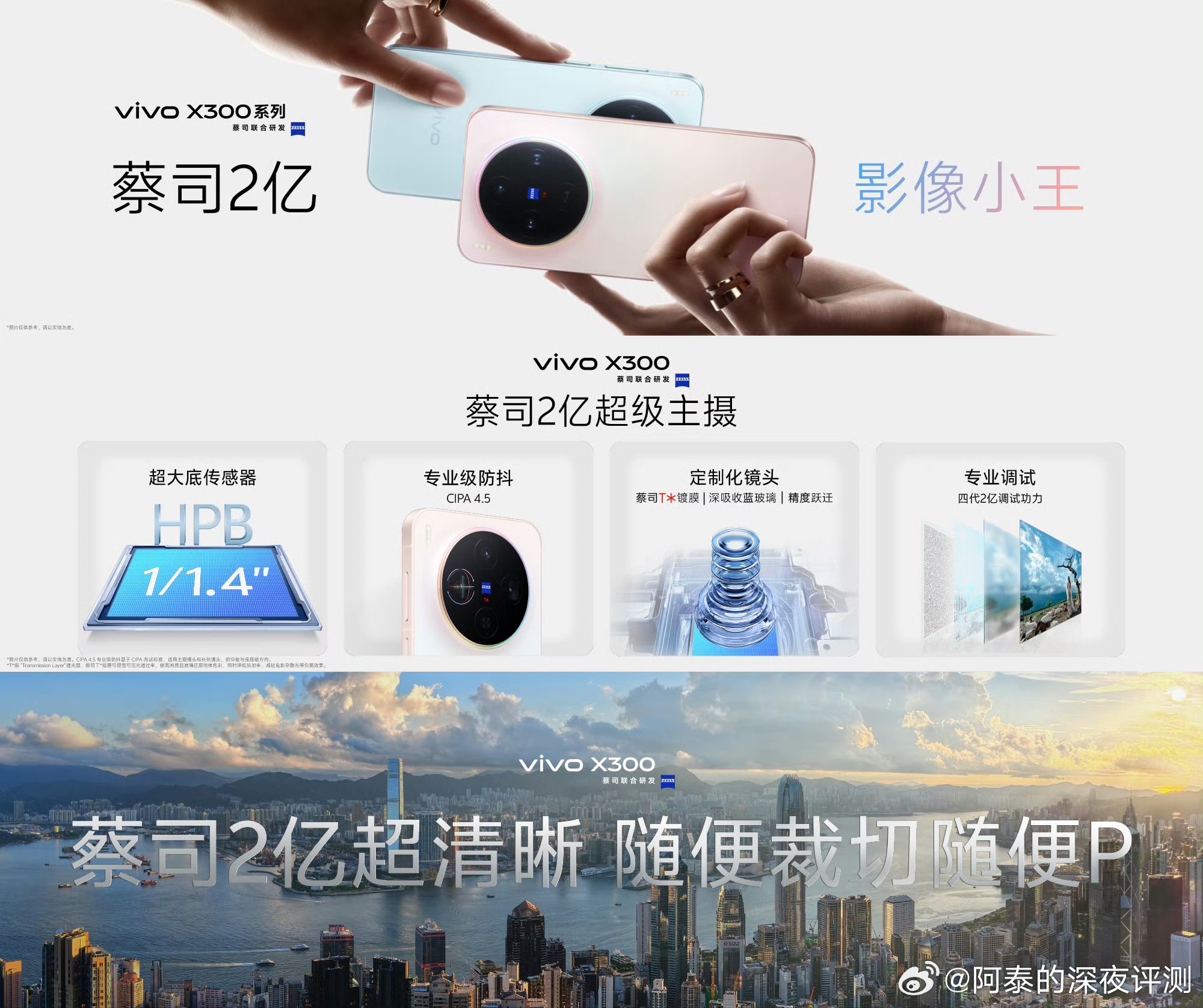 影像方面, vivo X300蔡司2亿超级主摄,联合三星定制HPB 1/1.4大底传感器,CIPA 4.5专业级防抖,大幅裁剪依然清晰,蔡司APO超级长焦,蓝图×索尼LYT-602,CIPA 4.5专业级防抖,支持vivo蔡司2.35x长焦增距镜,首颗蔡司认证前置镜头,蔡司5000万超清AF前摄,再加上AF自动对焦和92°的超广视野。