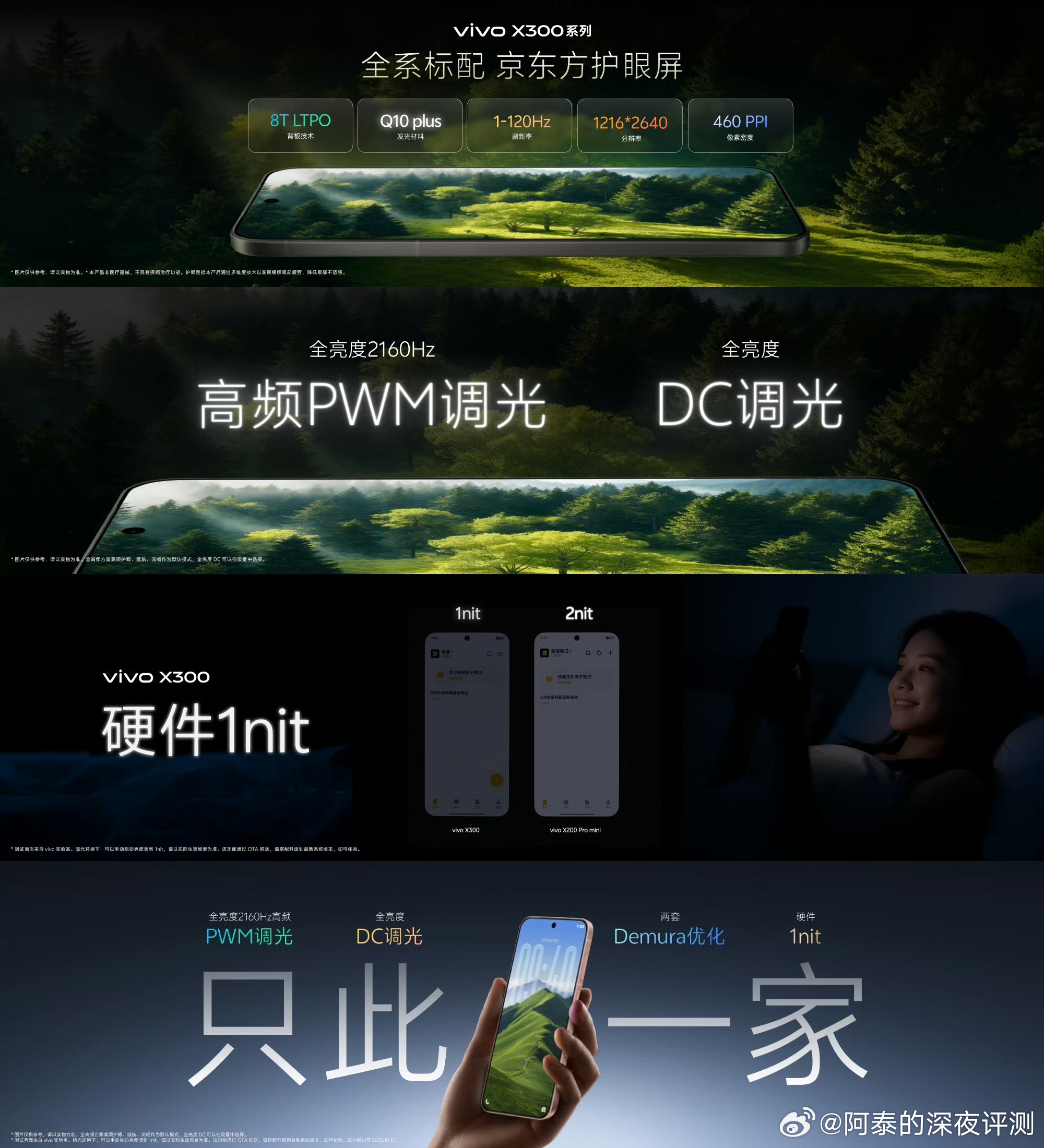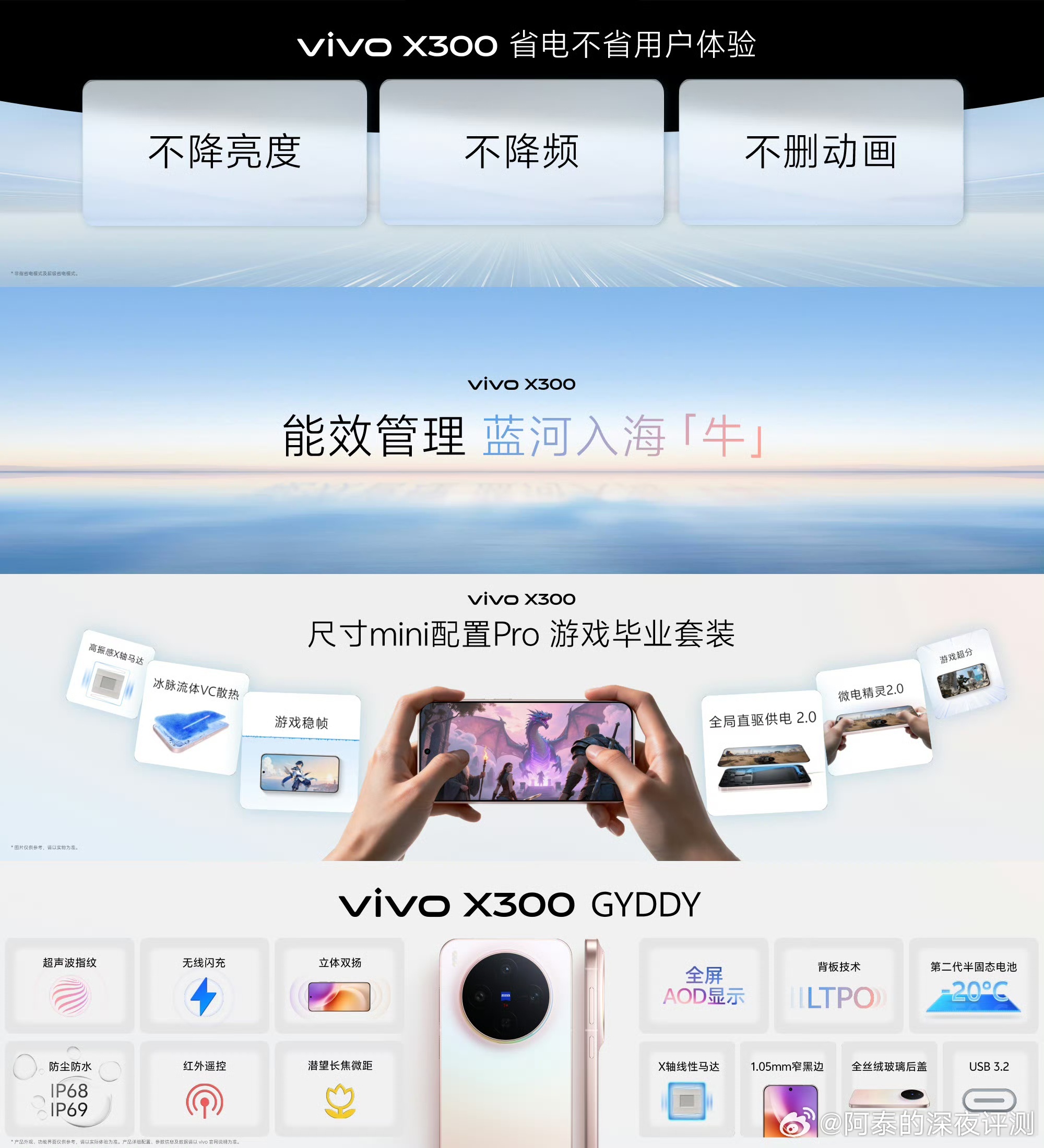 屏幕方面,vivo X300系列全系京东方护眼屏,全系标配8T LTPO。支持全亮度2160Hz 高频PWM调光、全亮度DC调光、双Demura优化、硬件1nit极暗屏,6040mAh蓝海电池,还有全系标配USB 3.2、微电精灵模式、全局直驱供电2.0,90W有线+40W无线闪充。