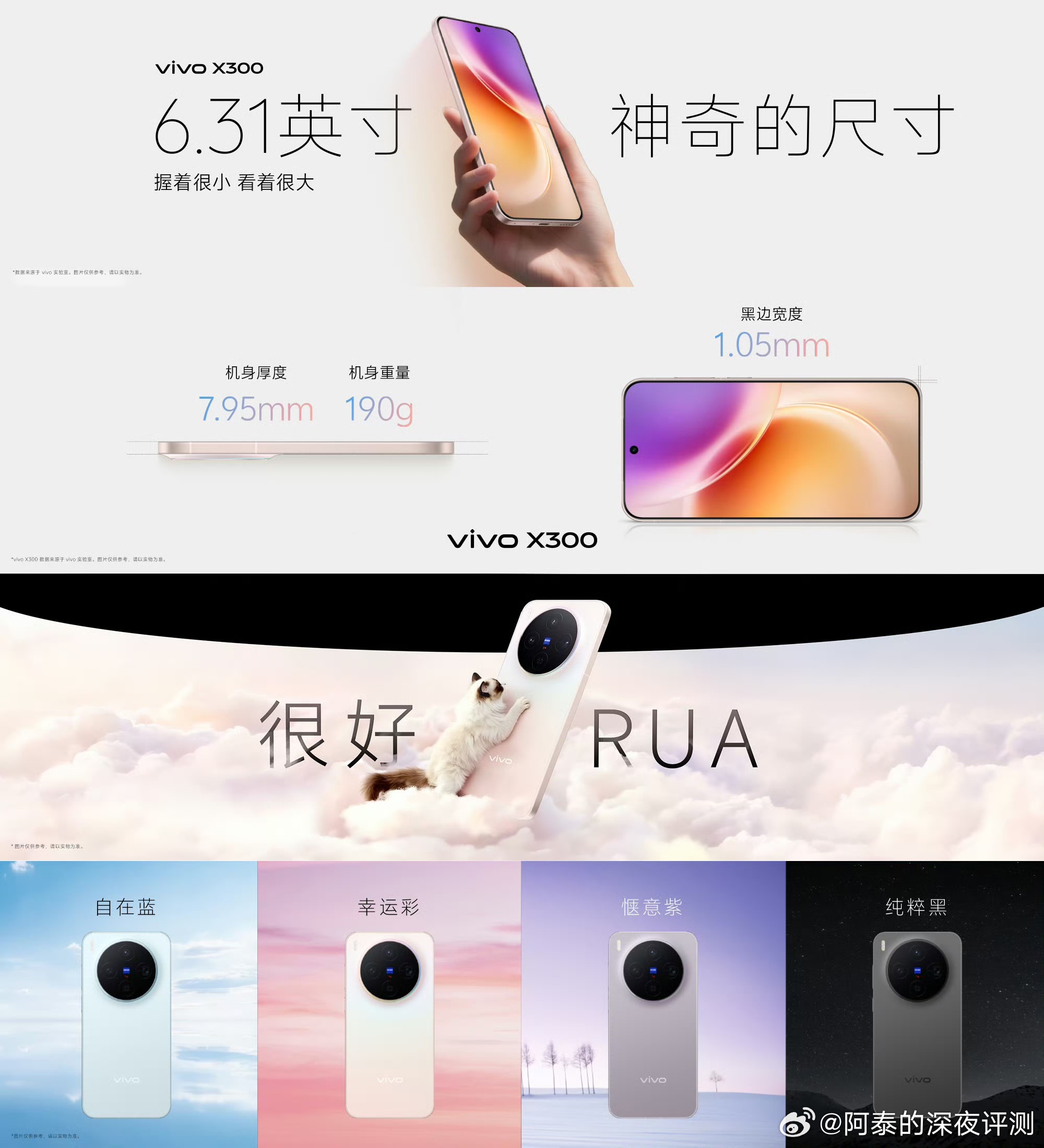 v6.31英寸黄金尺寸,四边仅1.05mm,轻薄至7.95mm、190g。镜头装饰区采用悬浮水滴冷雕玻璃工艺,自在蓝、幸运彩、惬意紫、纯粹黑,喜欢哪个配色??