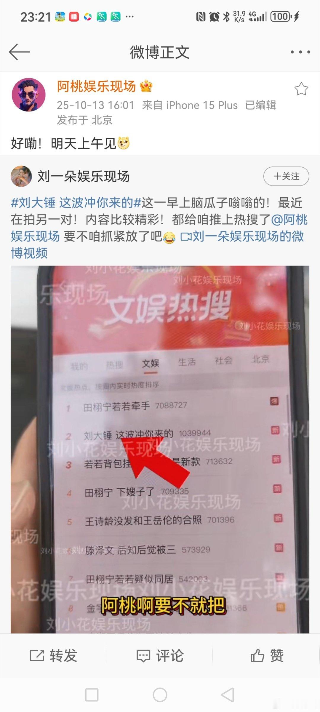 刘大锤说要发另一对恋情爆料10月13日下午,刘大锤通过发博晒出视频称:“这一