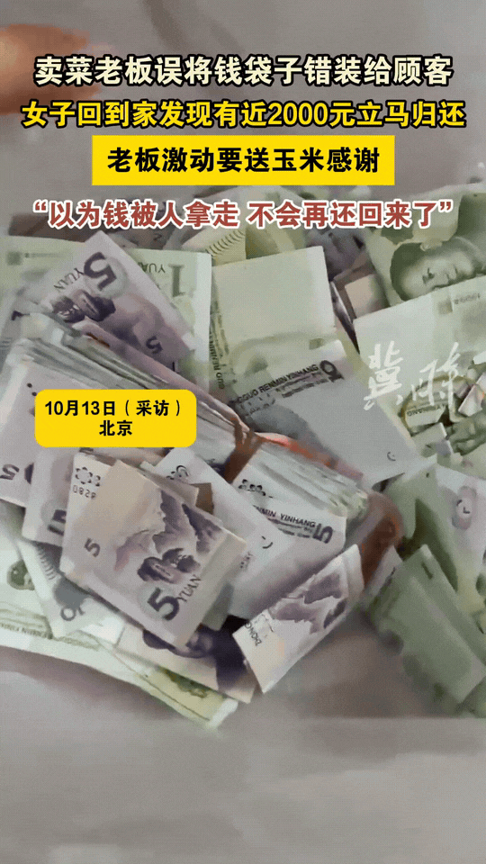 买菜送一兜钱?近日 北京,女子下班后买菜回家,收到老板递来的袋子后拎着就回家了,到家后却发现袋子里竟然全都是钱 足足有将近2000元,女子懵了好一会,反应过来应该是菜摊老板递错袋子了。 “这钱每一角都是辛苦钱,老板发现丢了肯定急坏了。”念及做买卖不易,陈女士没片刻犹豫,当即拎着钱袋赶回菜场。此时菜摊老板正焦急地翻找东西,见到陈女士递来的钱袋,整个人激动得蹦了起来,甚至和老伴差点相拥,连声道“真没想到还能找回来,社会上还是好人多”。 为表感谢,老板非要塞给陈女士几根玉米,还承诺“以后买菜都给你便宜,下次来甚至不能要钱”,不过都被陈女士婉拒了。她坦言,“不是自己的钱拿着不安心,送回去心里才踏实”。 这场意外的“金钱考验”,成了一次温暖的双向奔赴:陈女士的拾金不昧是刻在骨子里的道德自觉,老板的激动感恩则印证了“善有善报”的朴素共识。
