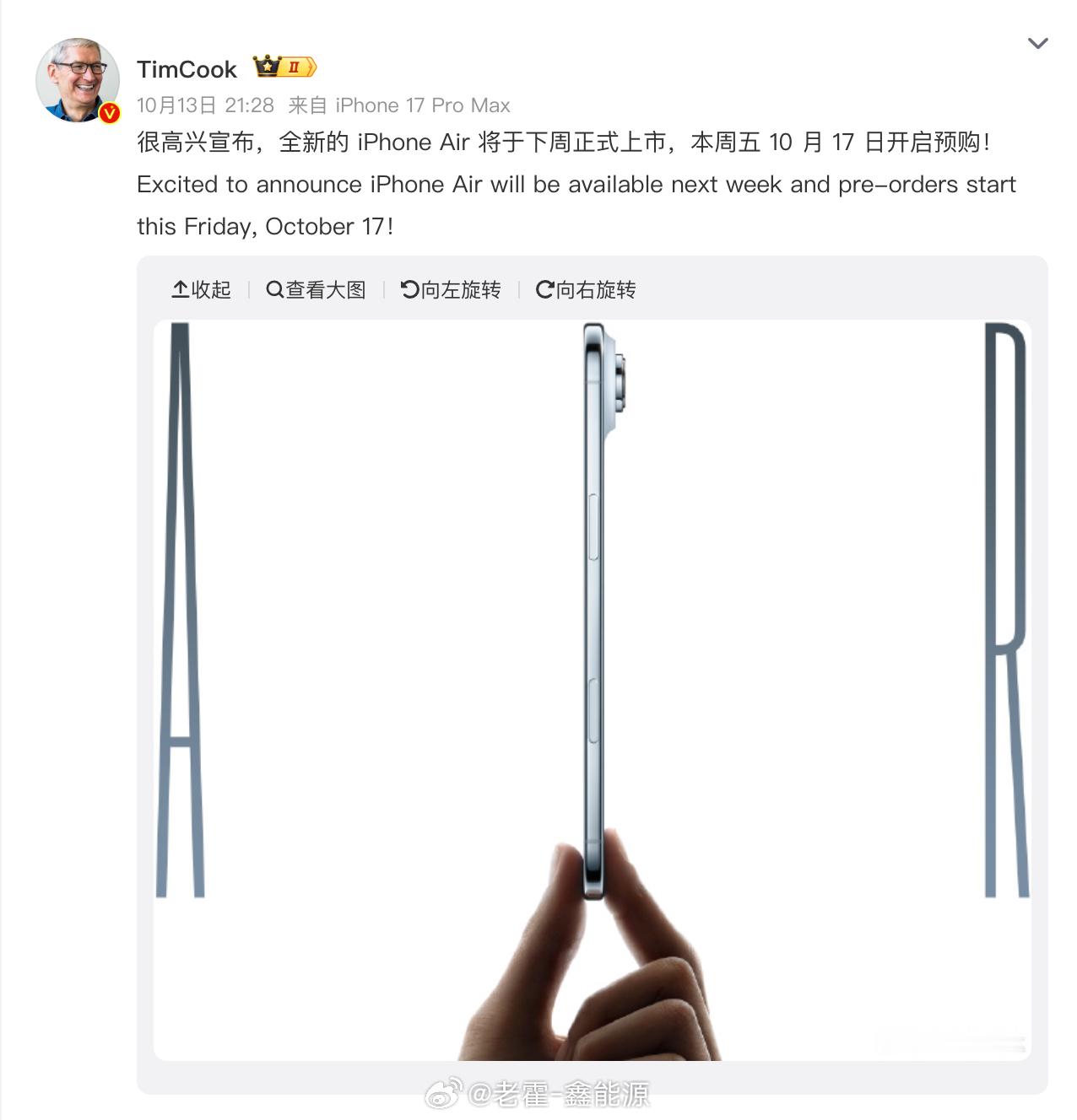 今晚库克宣布了国行版iPhone Air会在17号周五早上9点开始预售,(我个人觉得)Air最大的优势就是薄,其他可能就都是劣势了,属于一个长板配合多个短板,勺子类的产品了。