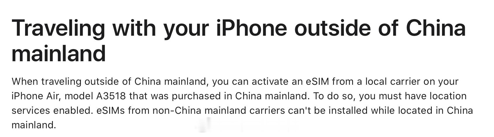 苹果官网也明去了,国行版本的Air,eSIM是可以支持境外的运营商的,但是前提是你必须要身处境外才能激活,并且目前eSIM开通挂失换机都要去运营商营业厅进行,不能网上操作,时隔多年,又回到了跑营业厅的时代。