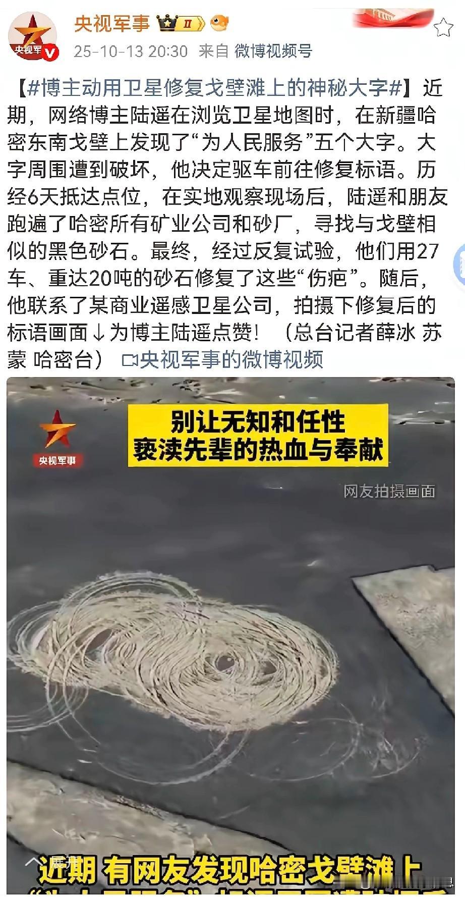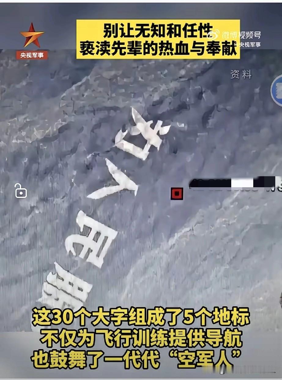 这下看你怎么狡辩! 央视军事报道了一个破坏“为人民服务”标语的事件,不能让无知让人性亵渎先辈的奉献! 空军第八航校在上世纪六十年代成立于新疆哈密,为了解决飞行员迷失方向的问题,在巨大的山体上做了标语,后来又做了更大的标语。 这些标语不仅指引飞行航向,还鼓舞了无数航空人,其中就有杨利伟等优秀人才。这些标语是历史的见证,是精神财富,必须保护,必须传承! 破坏精神财富,历史财富,法律财富,社会财富,行为必须严厉打击,破坏者要付出惨痛代价,追究法律责任!