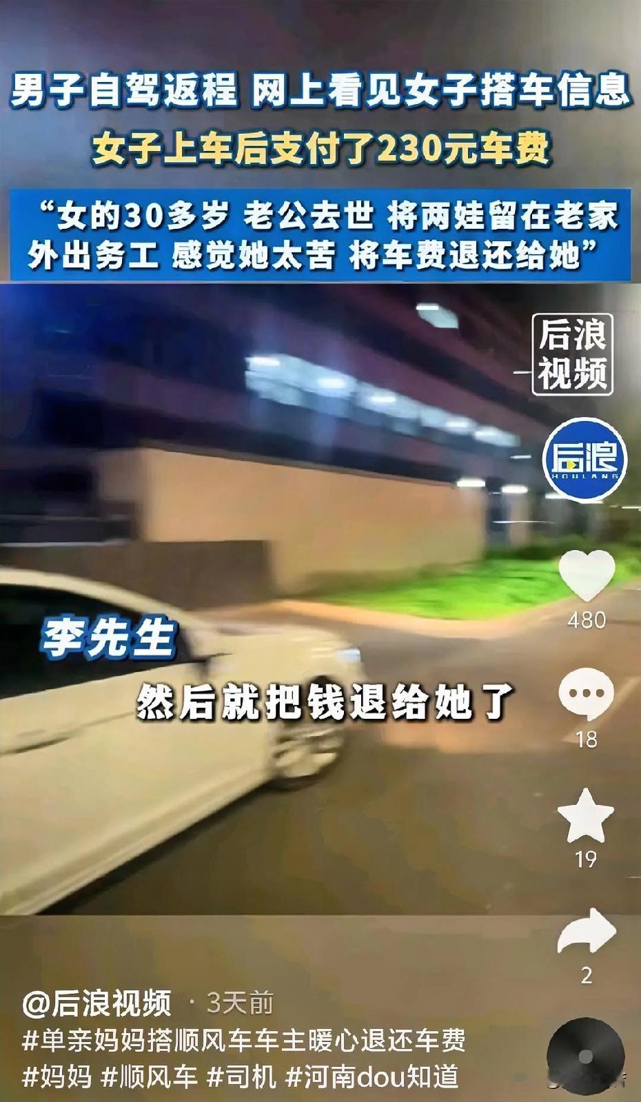 近日,河南民权,一名男子驾车返回宁波,捎带了一名搭车的女子。她上车后支付了230块钱的车费,没想到下车时,男子把钱退给她了。 女子上车后,孩子就打来视频电话,哭着不让她走,说舍不得妈妈。女子也哭了,她又何尝愿意离开孩子呢?可女子要外出打工赚钱养家。 女子安慰了孩子几句,狠下心把视频挂了。之后,女子一直低着头不说话。男子见她心情不好,便安慰开导她。 经聊天得知,女子今年30多岁,丈夫去年因病离开了,家里有两个孩子,大的13岁,小的5岁。为了撑起这个家,女子只能把孩子留在家里外出打工挣钱。 男子了解情况后,觉得女子一个人拉扯两个孩子,太不容易了,不忍心收她的钱,于是就退给她了。 男子表示,本想900多公里带个人回来,收点油钱,结果听到女子30多岁丈夫就去世了,把那么小的两个孩子放在家中出去打工,感觉心里真不舒服,要你钱干啥呀?俺全当做个好人,希望她日子越过越好。 这事儿听着就暖乎乎的,特像咱们身边会发生的小感动,没什么大道理,全是人心底那点软乎劲儿在作祟。 女子30多就没了老公,俩娃扔老家自己外出打工,光想这画面就觉得不容易——出门挣钱是为了孩子,可心里又牵挂着孩子,白天累得够呛,晚上说不定还偷偷琢磨家里娃吃得好不好,也没有想妈妈。 女子主动付车费,说明人家也懂规矩,不占别人便宜,知道人家开车拉自己是帮忙,该给的钱一分不少,这种“苦日子还守着本分”的劲儿,就挺让人佩服的。 男子本来就是顺路搭个人,收车费也是天经地义,毕竟油钱、过路费都是成本。但是他听到女子的家境,没多想就把钱退回去了,不是图啥回报,就是单纯觉得这姑娘太苦了,这点钱能让她少点负担就少点。 男子的反应特别真实,不是刻意装好人,就是看到别人难的时候,心里那点同情心、同理心冒出来了,顺手帮一把,就像咱们平时路上看见有人拎不动东西搭把手,看见老人过马路扶一下似的,没那么多该不该,就是不忍心。 其实,这事儿最打动人的,就是相互体谅——女的不贪便宜,男的不吝帮忙。现在网上总说人心复杂,可这种小事一出来就知道,大多数人心里揣着善良。 这男的退回去的不光是230块钱,更是给了这女的一点底气,让她知道出门在外不全是辛苦,也有陌生人的善意;而这女的愿意付钱,也让这份善意没变成理所当然,俩人都守住了自己的分寸,也暖了对方的心。 实话实说,生活里哪有那么多惊天动地的大事,就是你帮我、我体谅你的小瞬间,凑成了日子里的光。这男的做得实在,这女的过得不易也懂规矩,俩普通人的小互动,比啥大道理都让人觉得舒服。(来源:后浪视频)