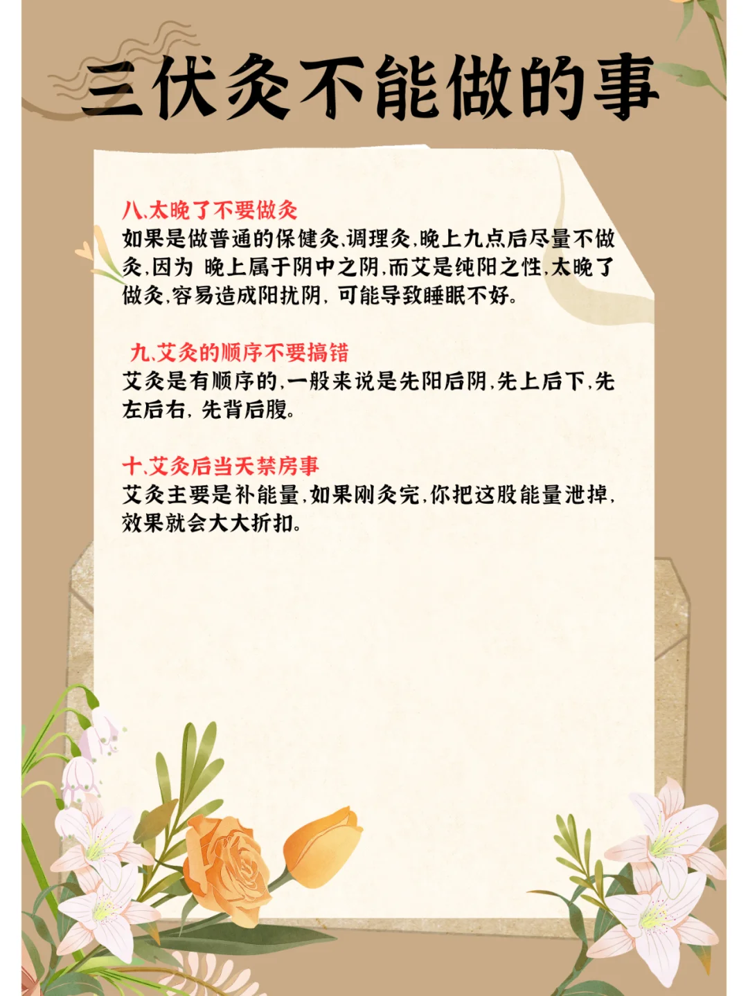 如果是做普通的保健灸、调理灸,晚上九点后尽量不做灸,因为 晚上属于阴中之阴,而艾是纯阳之性,太晚了做灸,容易造成阳扰阴, 可能导致睡眠不好。