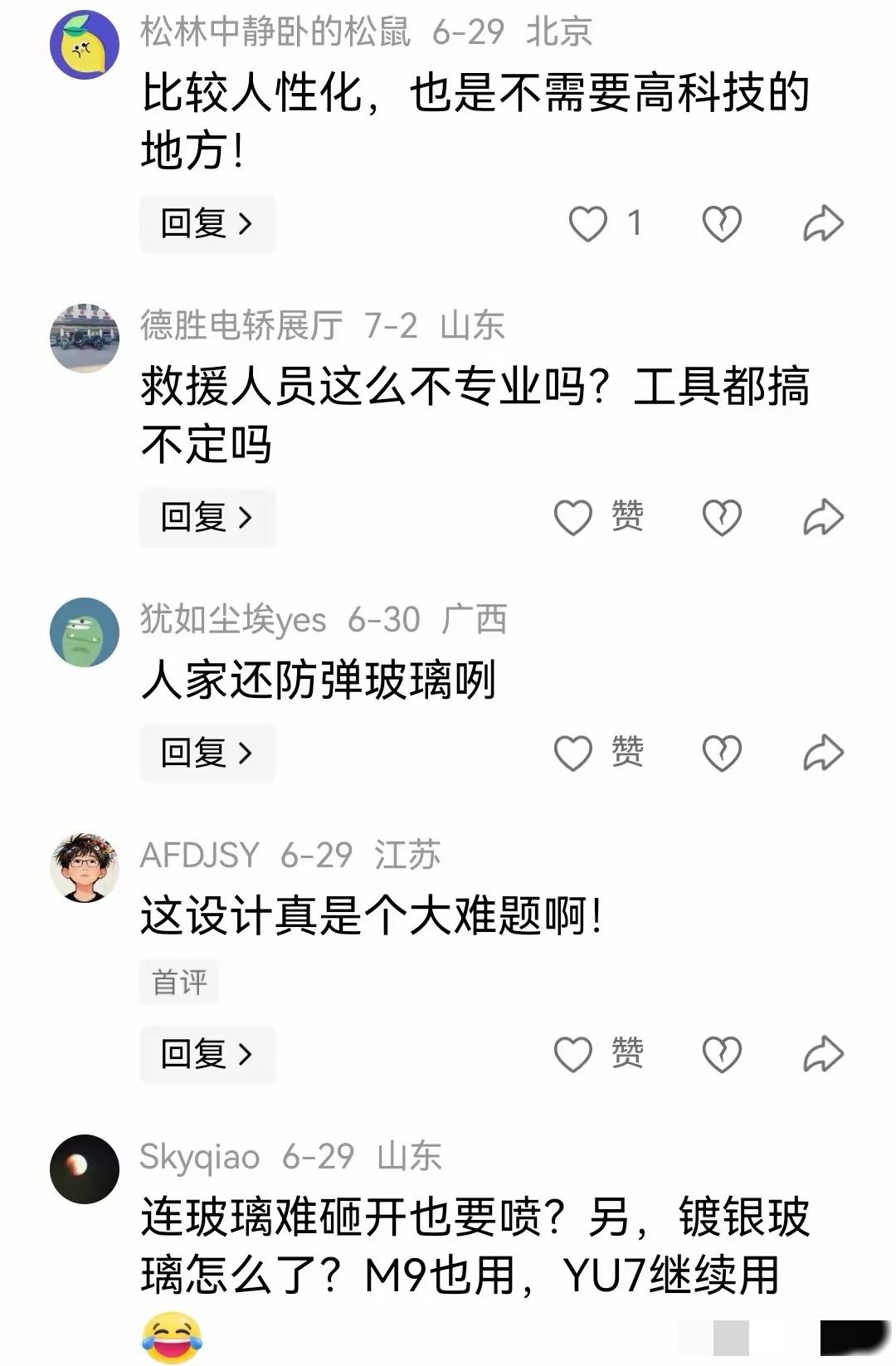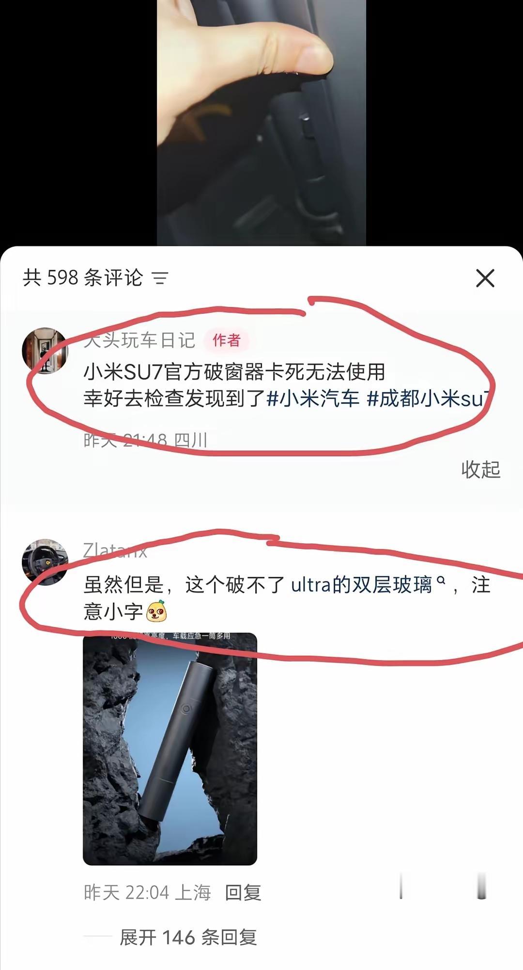 小米车主的“安全刺客”?这波操作真让人冒冷汗 成都小米SU7事故后,有SU7 Ultra车主赶紧查车里的安全装备,结果差点气笑——之前买的米家碎窗手电筒,居然在固定位卡得死死的,急用时根本拿不出来。 更扎心的是网友补刀:这手电筒压根破不了Ultra的双层夹胶玻璃,广告里早有小字备注只能破单层。想想真后怕,SU7 Ultra的四门都是声学夹层玻璃,中间的树脂层粘力极强,普通破窗器敲了也只会粘在一起。 安全装备最忌“中看不中用”。车企把玻璃升级成高端夹胶款提升体验,自家生态的应急工具却跟不上,这不就成了“顾头不顾尾”?更别说还会出现卡住这种低级问题,简直是给安全埋雷。 你们车里备的破窗工具真试过吗?敢说能配得上自家车的玻璃吗?su7小米事故