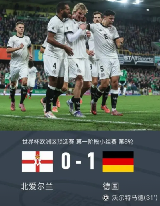 德国队又赢球了,客场1:0小胜北爱尔兰!虽然胜利,但场面看不到多占优,要不是通过一个角球沃尔特玛德头球攻门,德国队还真难拿下北爱尔兰,维尔茨依旧低迷,阿德耶米痛失单刀,北爱尔兰最后二十分钟对德国队进行了全面压制,可惜射门效率不高!无法摆平比分!德国队还是以净胜球优势位居小组第一!纳帅踢弱队都有点吃力,可得好好下点功夫了!