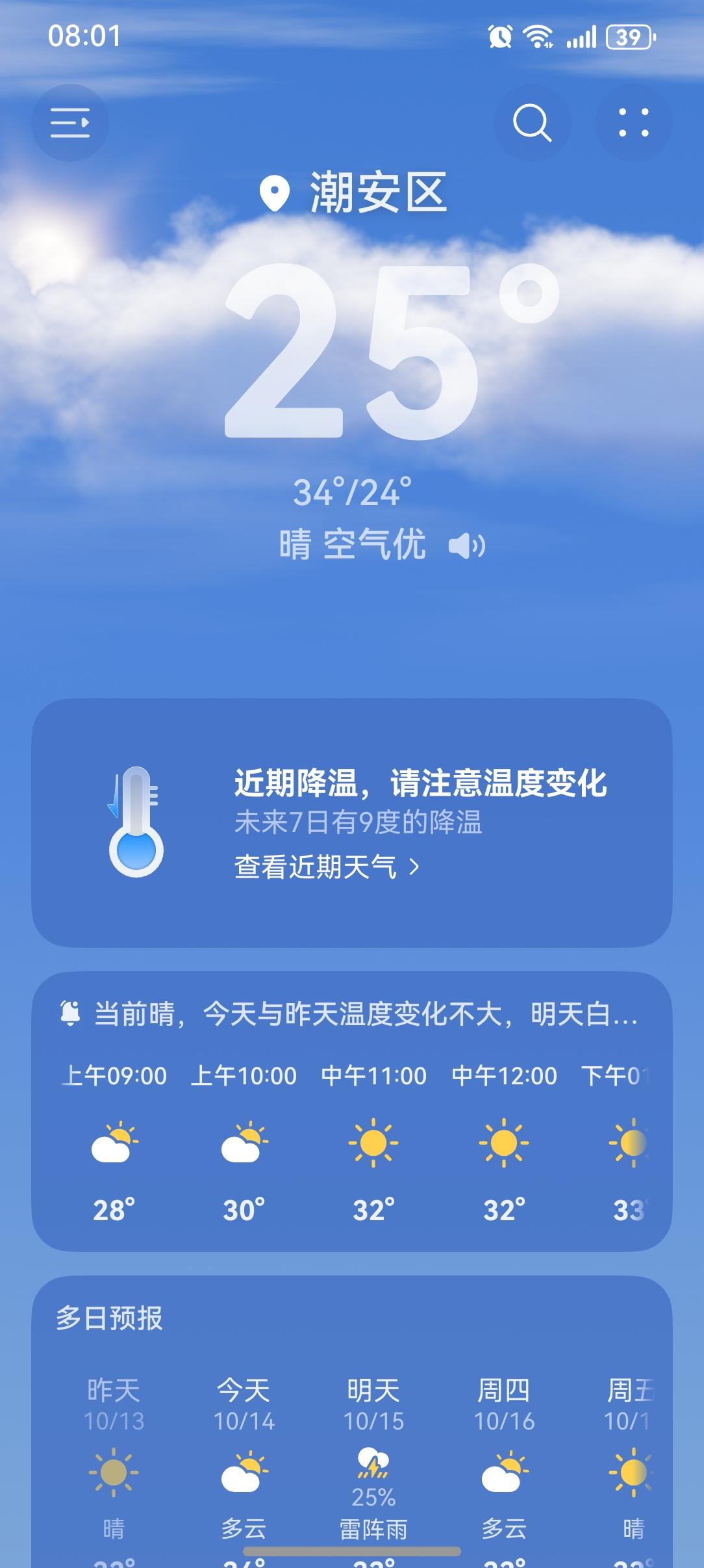 广东晴雨来回切换! 14-16日, 我省多云伴分散雷阵雨, 降水逐日趋于减弱。 今天(14日), 潮州喜提一个多云天气, 气温24-34℃, 此刻气温25℃。 今天看看今天的天空, 阳光如此灿烂, 暴晒的一天从早上开始! 看来, 今天依然又被高温硬控了! 这天气, 不喜欢, 差评了哈! 如此天气! 元芳,你怎么看? [捂脸][捂脸][捂脸][捂脸][捂脸][捂脸][捂脸][捂脸]