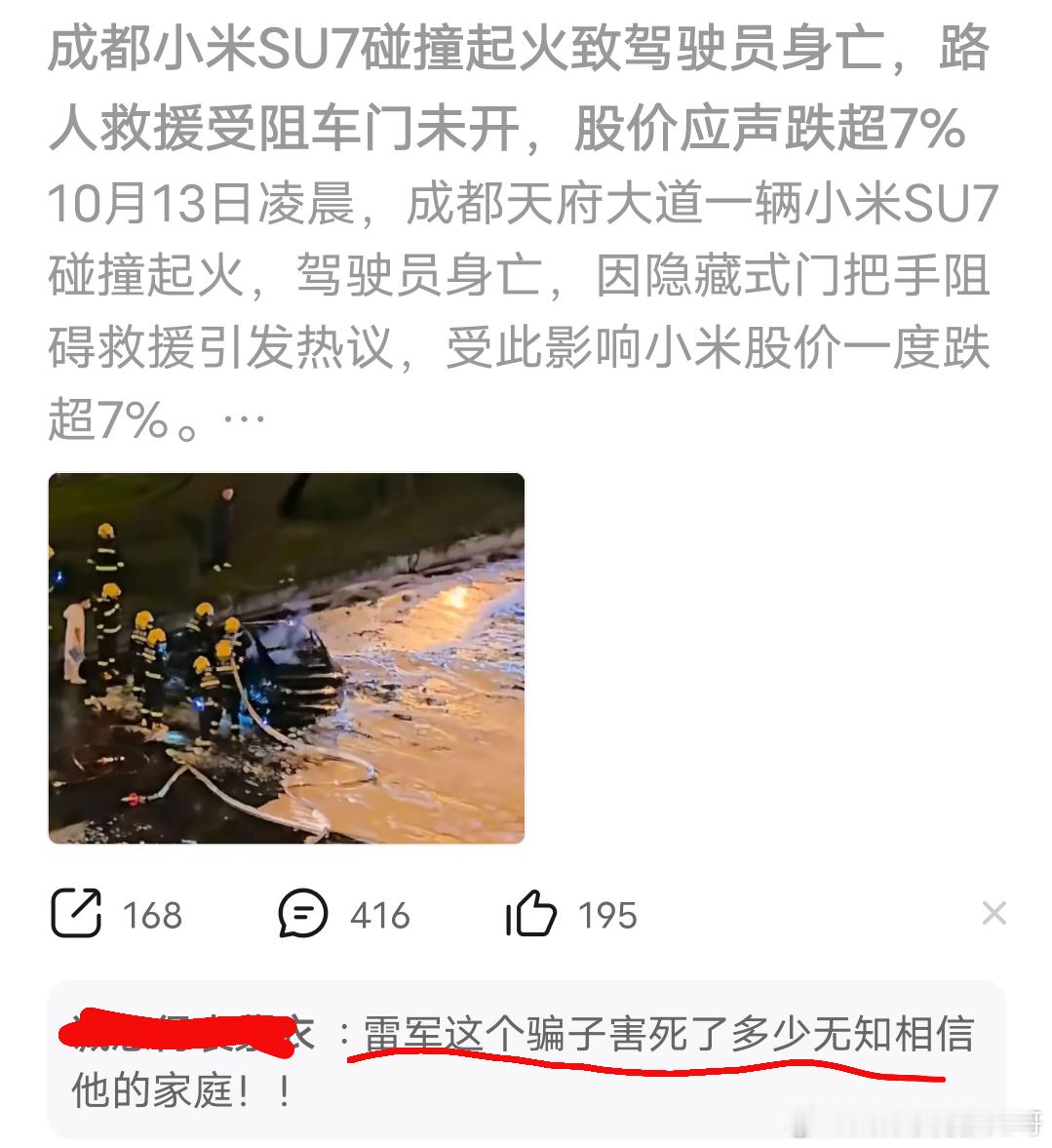 成都天府大道小米自燃 网上骂声一片