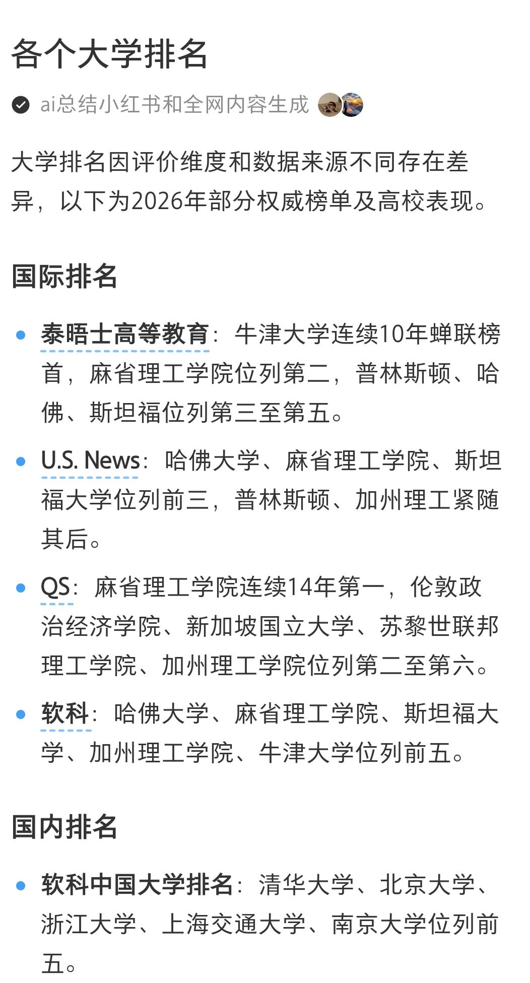《大学排名年年变,选校到底该看啥?聊聊2026年那些权威榜单里的门道》 大学排名这事儿,真跟盲盒似的,不同榜单能开出截然不同的“惊喜”。就说2026年这几份权威榜单吧,看完你可能和我一样犯迷糊——到底该信哪个? 先看国际榜单。泰晤士高等教育那儿,牛津大学硬是把榜首位置守了10年,跟个“常青树”似的。麻省理工紧随其后,普林斯顿、哈佛、斯坦福也在前五里站稳了脚跟。再看U.S. News,哈佛、麻省理工、斯坦福直接包揽前三,普林斯顿、加州理工也不甘示弱。QS更绝,麻省理工连续14年霸榜第一,伦敦政治经济学院、新加坡国立大学这些也冲进了前六。软科那边呢,哈佛、麻省理工、斯坦福、加州理工、牛津又组成了另一支“前五军团”。 国内的软科中国大学排名,清华、北大、浙大、上海交大、南大这五所,那是常年稳居前排的“老熟人”了。 可你发现没?同一所大学在不同榜单里的位置能差出一大截。就拿牛津来说,泰晤士里是老大,软科里排第五;麻省理工在QS里是王者,U.S. News里是老二。这是为啥?还不是因为每个榜单的评价维度不一样。有的看重学术研究,有的偏向就业口碑,有的又盯着国际影响力。 咱选校的时候,要是光盯着排名数字,那可就掉坑里了。比如你想学金融,伦敦政治经济学院在QS里排名挺靠前,它的金融专业更是顶呱呱;你要是痴迷工科,麻省理工、斯坦福那是多少工科生的梦校。还有咱国内的清华、浙大,工科实力那也是有口皆碑。 再说了,排名这东西年年变,今年你在山顶,明年可能就到山腰了。学校的底蕴、专业的实力,那可不是一个排名能说清楚的。就像牛津,能连续10年在泰晤士夺冠,靠的是百年积累的学术沉淀;咱国内的清华北大,也是一代代学子拼出来的口碑。 所以啊,选大学这事,排名只能是个参考。关键得看自己想学啥,将来想干啥。别被那些数字迷了眼,适合自己的才是最好的。 最后想问问大家,你们觉得选大学时,排名、专业、城市哪个更重要?来评论区聊聊你的看法~大学排行 大学排名 全球大学排行 全球大学前百强 全球高校排名 QS大学排名 QS大学排行榜
