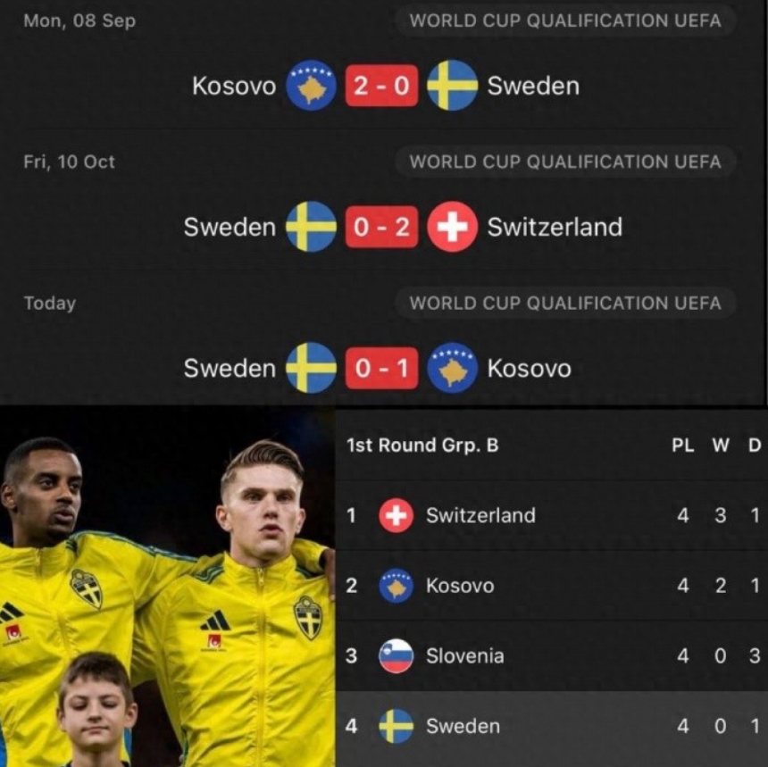 世预赛赛场,瑞典0-1不敌科索沃,瑞典无缘直接晋级世界杯。 本场约克雷斯、伊萨克