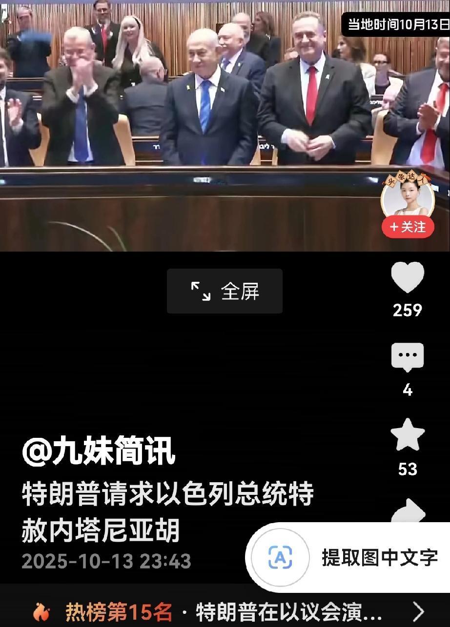 特朗普13号在以色列的议会中建议以色列不用再追究内塔尼亚胡的罪行,要以总统赦免其罪行。 巴以的和平还有一个巨大障碍,那就是内塔尼亚胡害怕战争结束后,以色列法院将对内塔尼亚胡所犯的受贿罪、失信罪、欺诈罪三重罪行进行审判,为了逃避审判,内塔尼亚胡将选择战争,这一点美总统也心知肚明,所以为了促成巴以停火协议得到以色列的贯彻执行,特朗普在以色列的议会中提出了赦免内塔尼亚胡的罪行。 这次在埃及举行的巴以和平峰会现在才知道为什么特朗作为峰会的主导者首先要去以色列参加以色列的议会了,原来这场以色列的议会就是为了消除内塔尼亚胡的担心而精心准备的,只有战争结束后,以色列法律不再追究内塔尼亚胡的三重罪行,内塔尼亚胡在和平路上的执行行动因为甩脱了心里包袱,轻装上阵,和平可能才会真正到来。 特朗普的建议、赢得了以色列议会的赞许,免除对内塔尼亚胡的罪行有了议会的保障,内塔尼亚胡心底里的一块石头终于落地了,参加完以色列的议会后,特朗普邀请内塔尼亚胡前往埃及一同参与和平峰会,原来内塔尼亚胡是不准备去的,现在心里的包袱没有了,内塔尼亚胡爽快的答应了一共前往。 原以为特朗普做事大大咧咧,做事毫无分寸,原来这家伙也是很心细的。