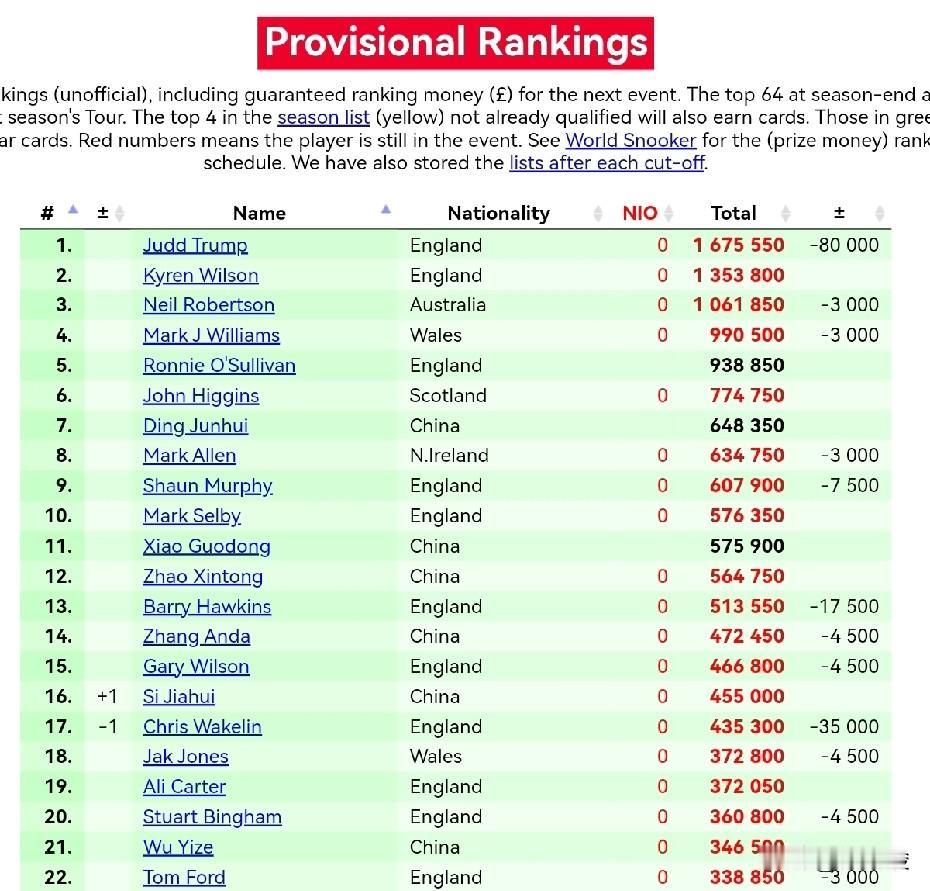 斯佳辉幸运保住前16位置。由于之前排名第16的韦克林要扣除3.5万英镑高额积分,原本跌出前16的斯佳辉幸运回到了前16。 2023-24赛季,韦克林打进北爱尔兰公开赛决赛,但输给特鲁姆普,获得亚军和3.5万英镑奖金。今年的北爱尔兰公开赛正赛将于19日开打。韦克林和斯佳辉直接进正赛,第一轮斯佳辉将对阵张家玮,韦克林则对阵蓝裕豪。 第二轮,斯佳辉和张家玮之间的胜者将迎战马奎尔和布雷切尔之间的胜者,如果斯佳辉第一轮获胜,第二轮也将面临考验。 第二轮,韦克林与蓝裕豪之间的胜者将迎战福德和傅家俊之间的胜者,双方实力都不弱。 就是说,前16的竞争激烈。目前,侥幸留在前16的斯佳辉的积分,只比韦克林多比1.9万英镑左右,差距不大,因此斯佳辉若要保持前16位置,还需多多努力。