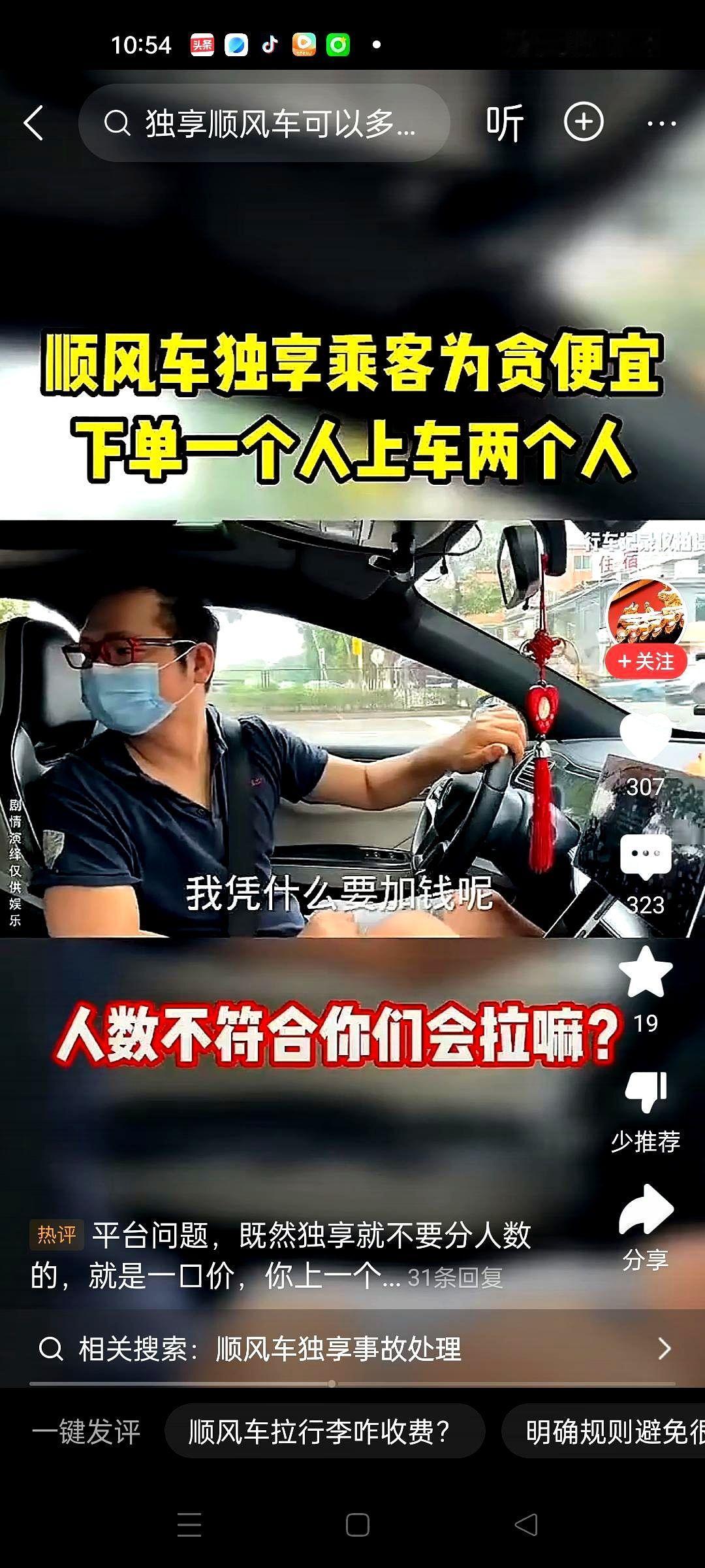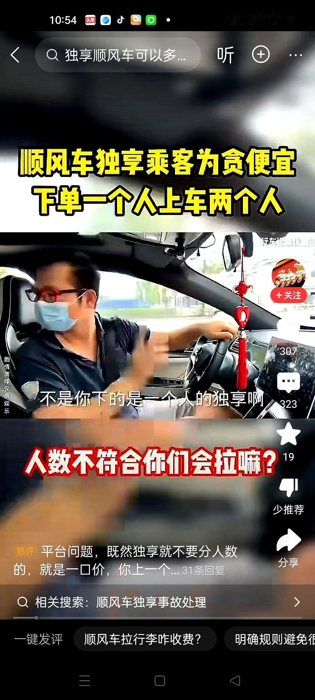 乘客为贪小便宜,订顺风车时只下了一个人的独享单。 但他却还带了一个人上车。 司机说你们要么下去一个人,要么加钱。 乘客叫嚣,我独享就是包车,你管我坐几个人,我再带2个人,你也得拉。 司机很无语,说你们取消订单吧,我不拉了。 乘客坚持不下车。 双方就这样僵持着。 网友对此表达观点: 都是那些没有底线的司机惯的,让一些乘客以为独享就是包车[发怒] 顺风车,司机是可以带亲友的,恰好有富裕座,行程又很顺,就可以接个顺风车单。打独享的顺风车不是包车,只是代表你不接受拼车,司机接上你直接把你送到目的地,不会因为送别人而绕路。打独享顺风车需要如实选择乘车人数,一是人数不一样价格不一样,二是司机车上带亲友的话,有可能坐不开 说一声,一个人独享保险只包一个人 万一出点事,另外一个是不在保险范围之内 归根结底就是搞的那什么独享,一人独享二人独享。出来这个这是脱裤子放屁