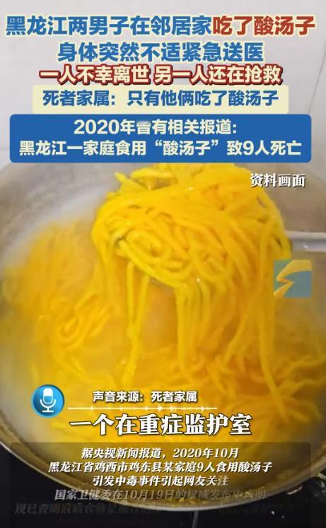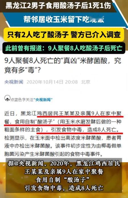 太不幸了!10月12日,黑龙江齐齐哈尔的张某,就因为帮助邻居家收了点玉米,邻居为答谢,特意弄了点好吃的,谁都没想到,等张某和他的亲戚吃过后,悲剧却不幸发生了。 10月12号那天,同村邻居家的玉米该收了,可家里人手不够,急得不行。 张先生(化名)是出了名的热心肠,一听这事儿就拉上亲戚刘先生(化名)去帮忙。 那天早上天还没亮,他们俩就到了地里。 玉米杆子高、地里泥巴多,掰玉米、装袋子、抬筐子,干到天黑,腰都快直不起来。 到了傍晚,总算把一大片地的玉米都收完了,邻居一家连声道谢。 邻居觉得过意不去,硬拉着他们俩去家里吃顿饭:“忙活一天了,哪能就这么走?得尝尝我家做的酸汤子,咱东北这玩意儿,外头可吃不着。” 屋里灯光昏黄,桌上摆了满满一桌子菜:大盘炖菜、热乎乎的馒头、几碟小咸菜。 邻居媳妇端上一锅刚煮好的酸汤子,白气直往上冒,酸香味儿一下子就飘满屋。 张先生和刘先生早就饿坏了,也没客气,各自盛了一大碗,呼噜呼噜地吃起来。 其他人有的说不太爱吃,有的忙着照看孩子,碗都没动几下。 那时候大家都笑着聊天,谁也没往心里去,只当这是一顿再普通不过的收工饭。 饭后几个人又唠了会儿嗑,谁也没觉得有啥不对。 可刚回家没多久,张先生就开始肚子疼,疼得直不起腰,紧接着上吐下泻,整个人没力气。 刘先生那边也差不多,刚到家门口就晕倒在地。 家里人吓坏了,赶紧喊人帮忙。 村子离县城医院三十多公里,路又坑洼,夜里开车更难走。 家人急得团团转,好不容易凑到车,连夜往县城赶。 可车刚走到半路,张先生就不行了。 到了医院,医生只摇头叹气。 刘先生送进了ICU,一直昏迷不醒。 这消息一传开,全村人都炸了锅。 大家都说同桌吃饭的人只有他们俩出事,八成是酸汤子有问题。 警方也来了,说得做法医检查,查查到底怎么回事。 酸汤子是玉米水磨了发酵做的,有人怀疑是发酵时间太久,有人说是玉米泡坏了,说啥的都有。 几年前鸡西也出过类似的事,一家九口吃酸汤子,最后八个都没了。 后来专家说,是“米酵菌酸”在作怪。 那是一种有毒物质,煮多长时间都杀不死,人一旦中毒,几乎没得救。 懂行的老人说,酸汤子、臭碴子这类发酵食品,最怕的就是环境不干净。 要是玉米泡的时间太长、温度太高,或者发酵完放太久不吃,就容易变质。 看起来没问题,闻着也没怪味,其实毒素早就在里面了。 现在张先生的后事还没办,刘先生在ICU的花费一天比一天多。 邻居家也愁得直掉泪,本是想好心答谢,谁能想到惹出人命。 每天都往医院跑,见到张先生的家人一句话也说不出口。 这事让人心里堵得慌,也给乡里乡亲提了个醒。 咱老百姓爱吃的这些“老味道”,再熟悉也得当回事。发酵的、泡的、腌的东西,只要看着不对劲、闻着不对味,宁可倒掉,也别硬往肚子里送。 一顿饭,一场好意,却换来一条命。 张先生的去世,让人明白了一个再朴素不过的道理,吃啥都别冒险,平平安安,比啥都强。 对此你怎么看? 信源:闪电新闻