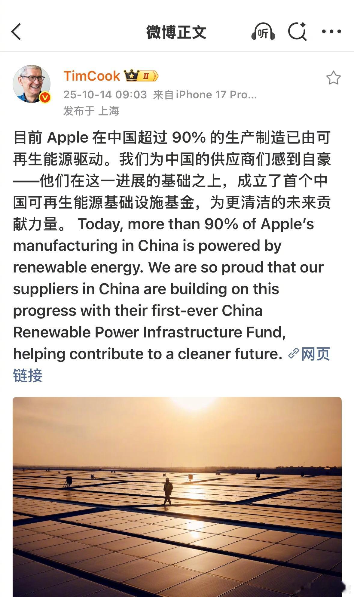 库克:苹果在中国超过90%的生产制造已由可再生能源驱动。成立首个中国可再生能源基础设施基金。