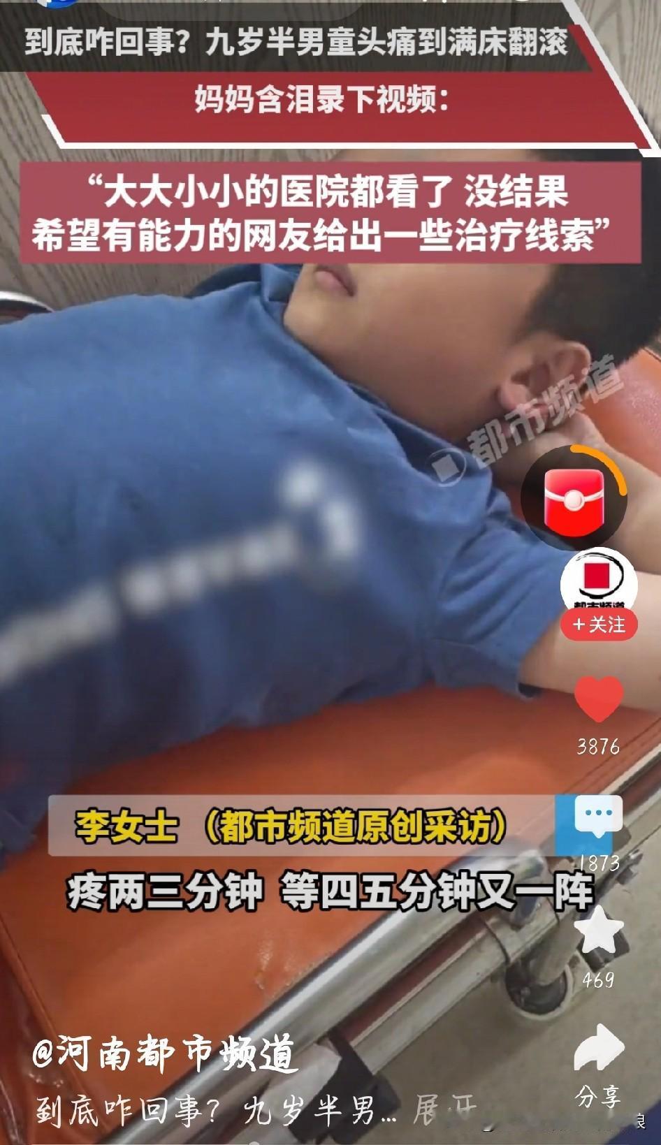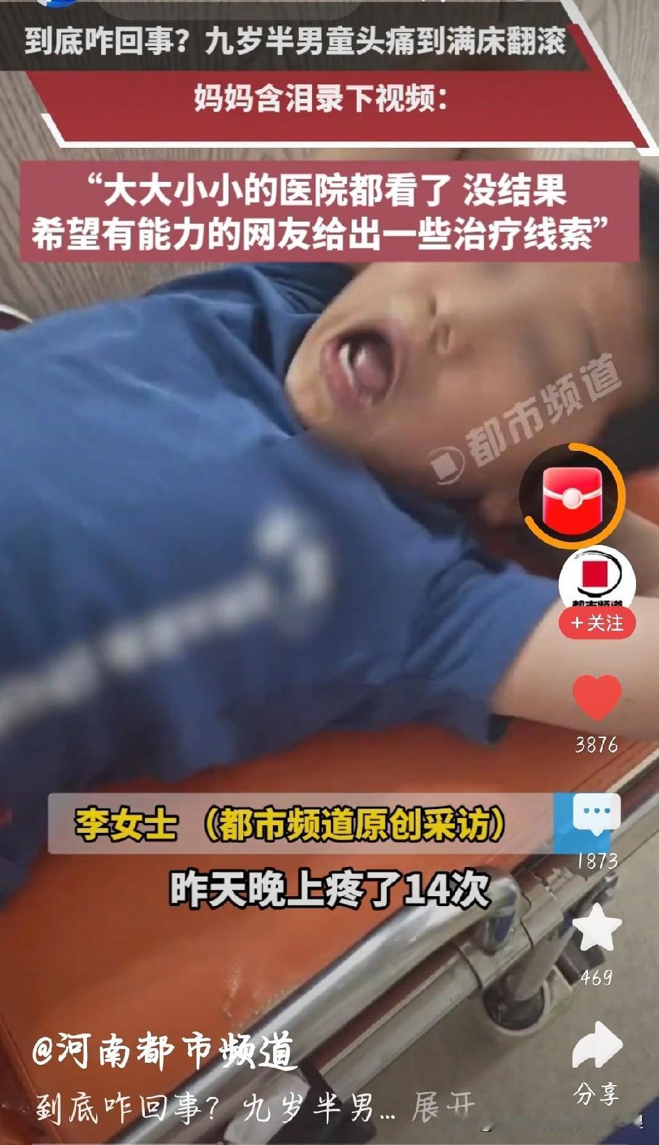 河南许昌9岁半的男孩,被头痛折腾得直在床上翻滚,疼起来连饭都吃不下,可爸妈带着他跑了好几家医院,查来查去却没找到明确原因,这事儿看得人揪心。 孩子的头痛不是偶尔疼一下,是一阵一阵的剧烈发作,发作时脸色发白、直冒冷汗,爸妈抱着他哄都没用。去医院做了不少检查,CT、抽血查了个遍,排除了脑炎、脑肿瘤这些吓人的大病,可头痛的病根就是没找到。 其实小孩头痛的原因特复杂,不是所有都能一眼看穿。有的是鼻窦发炎刺激的,毕竟孩子鼻窦没长好,炎症一犯就容易牵着头疼;有的是脑血管调节没成熟,稍微累着、睡不好,血管一扩张就疼得厉害;还有的可能是近视、用眼过度,或者精神紧张攒出来的毛病。 现在最熬人的是,查不出原因就没法对症治。爸妈只能眼睁睁看着孩子遭罪,一边到处打听靠谱的医生,一边试着调整孩子的作息、饮食,盼着能减轻点疼痛。 这事儿也给所有家长提了个醒:孩子喊头痛千万别不当回事,尤其是疼得厉害、频繁发作的,一定要尽早去查。也希望能有更多专业医生看到这孩子的情况,帮他找到病因,让这家人能松口气。 河南许昌9岁半男孩头痛满床翻滚 四处求医无果 头疼病 图片截图于河南都市频道