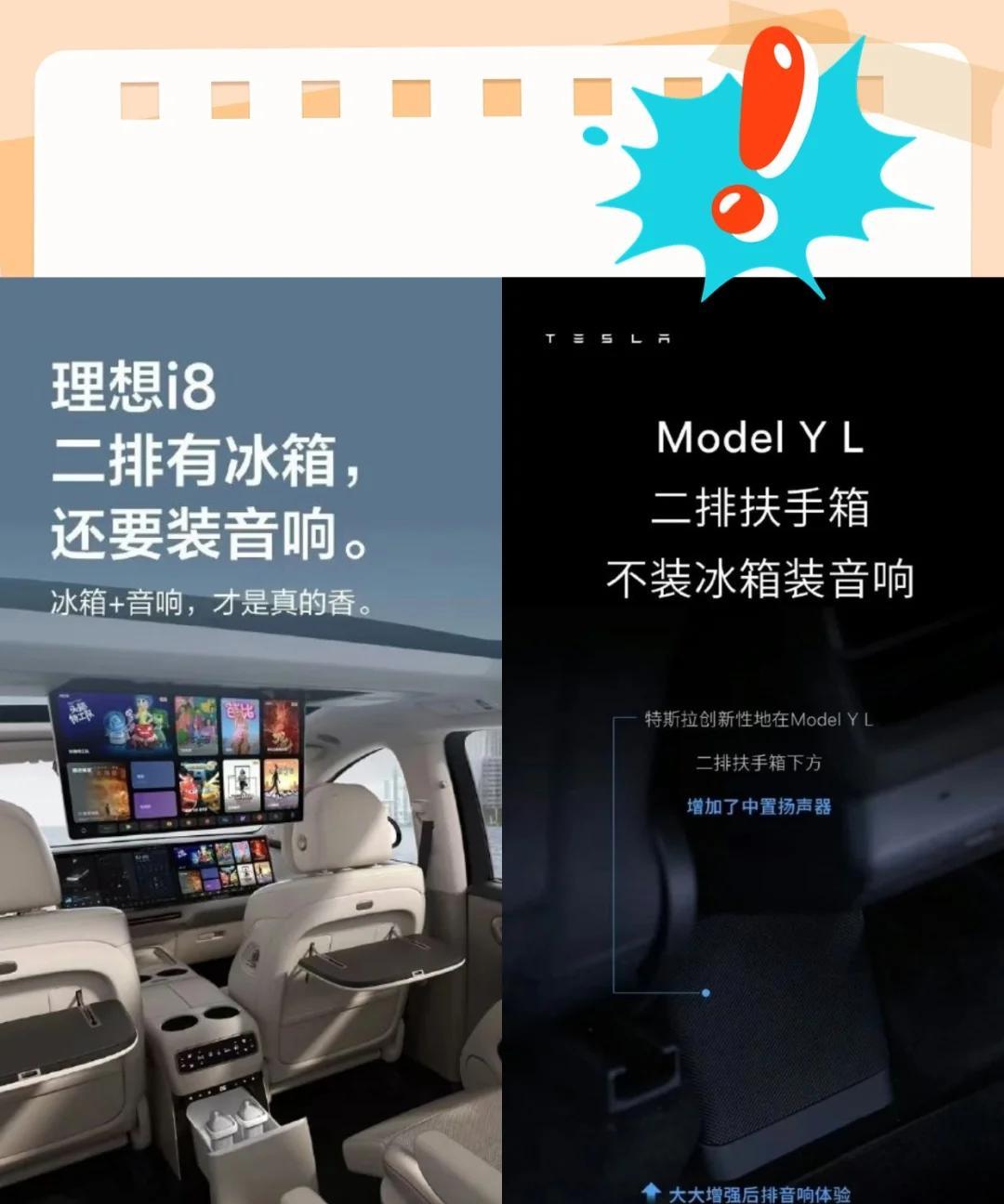 这不呼应上了!?? 特斯拉Model YL:二排扶手箱,不装冰箱装音响 理想i8:二排有冰箱,还要装音响 你们要考研啊,满嘴的顺口溜!!!