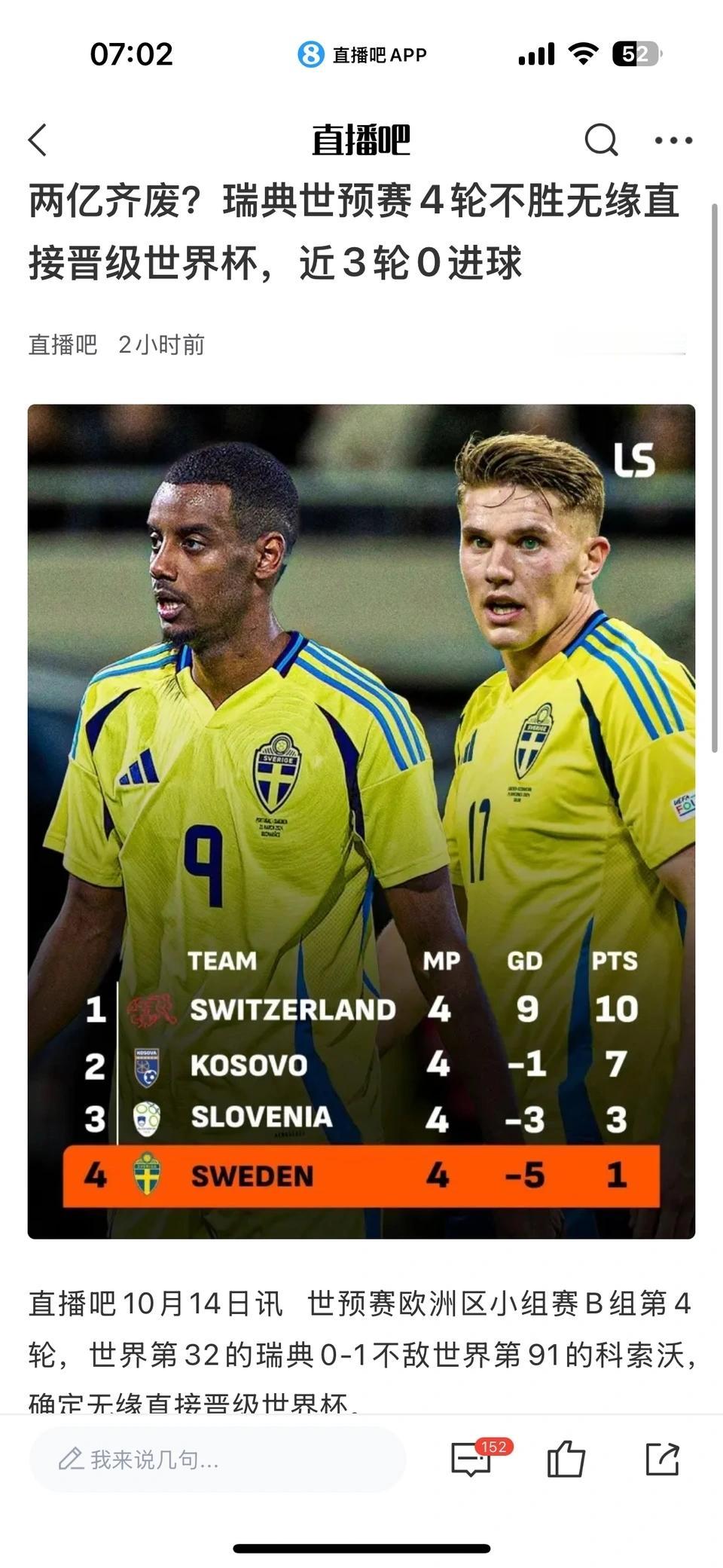 标题好狠啊,瑞典两亿齐废??到底是利物浦影响大,还是阿森纳影响大? 这里面是利物浦的1.5亿伊萨克,阿森纳6700万的哲凯赖什,两人在瑞典0进球,帮助瑞典无缘明年世界杯。 英超双雄志在争冠,要是锋线不行被拖累,那么整个赛季都是失败的,不仅仅是金钱损失,丢冠才是最害怕的。 利物浦球迷期待伊萨克20+进球,阿森纳球迷期待哲凯赖什15+进球,这就行了。[可怜]