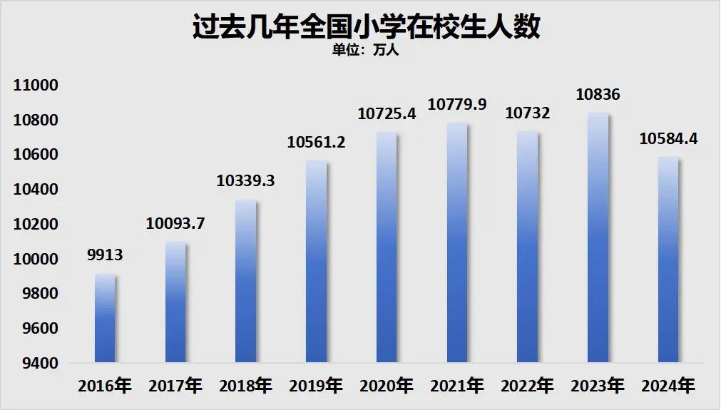 2023年与2024年,幼儿园在园人数两年合计减少了1043.56万人。 2024年小学在校生人数较2023年减少了251.6万人。