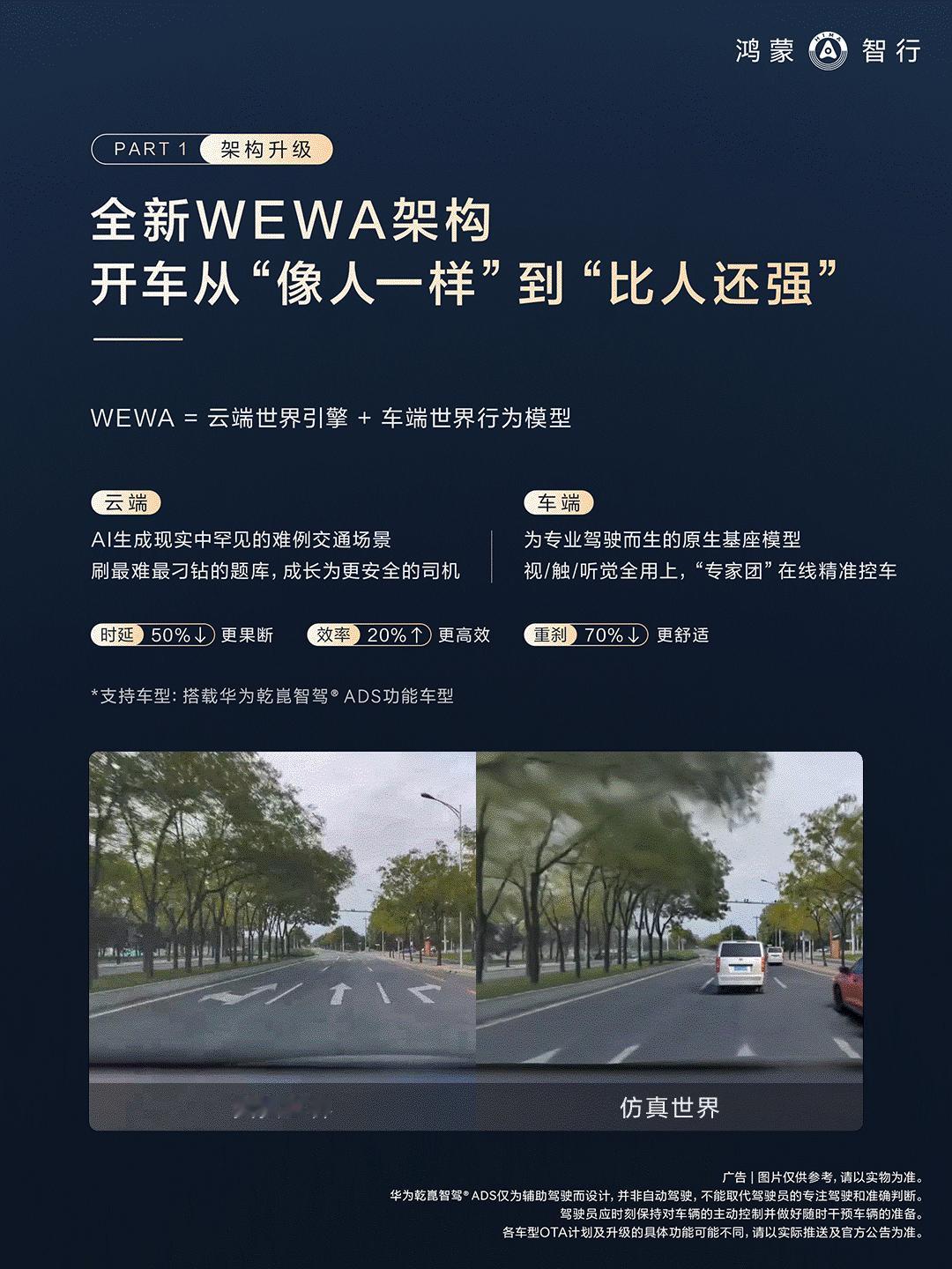 第一,架构升级。技术架构是基础,友商推出了VLA、VLM等技术,鸿蒙智行拿出了WEWA架构。在云端已最困难的方式训练,在现实世界带来更舒适的体验。
