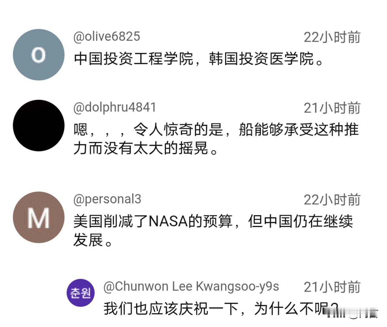 海上发射成功!韩网友:差距越拉越大,韩国很难跟上。 10月11日上午,我国在山东东部附近海域使用“引力一号”火箭,成功的将三颗卫星送入预定轨道。此次发射是继去年1月之后,“引力一号”火箭第二次执行海上发射任务。 韩媒对此进行了报道,并引发了韩网友的热议。有韩网友认为,中国在航天领域成为领头羊已为时不远;还有的则表示,韩国很难再跟上等。 从韩网友的言语中可以看出,我国在航天领域的成就令他们羡慕,并渴望韩国有朝一日也能够成为太空强国…