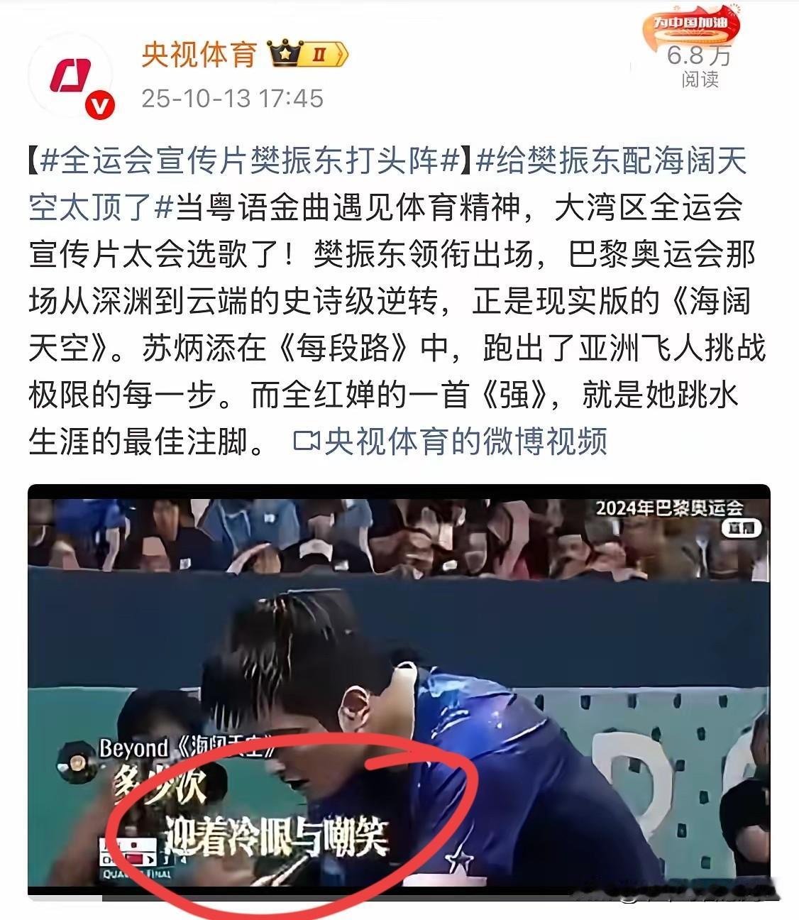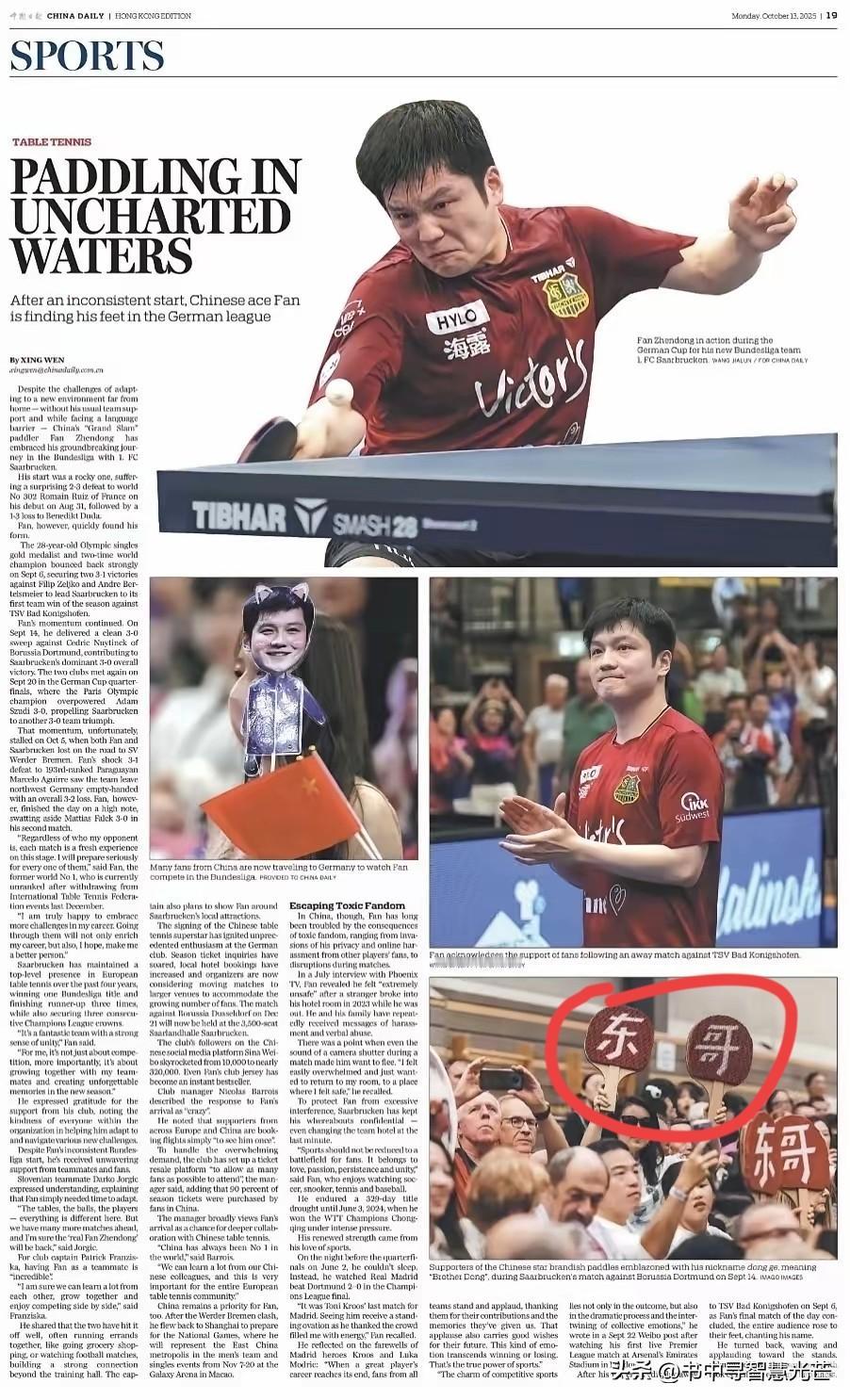今天的央媒版面,几乎被樊振东承包了!这待遇,足见他有多受关注。 10月13日的《人民日报(海外版)》特意用一整个版面,刊发了题为《Paddling in Uncharted Waters(摸着石头过河)》的文章,把他的德甲之旅讲得明明白白。里面不光说了他4胜3负的战绩,连爆冷输给世界排名173位选手这样的细节都没落下,还分析了他带来的明星效应和外界反响。文章里还提了今年7月他在凤凰卫视的采访,说他旅欧期间会去看英超、西甲比赛,连生活安排都扒得清清楚楚,真是够细致的[__LINK_ICON]。 这边《人民日报》刚夸完,央视体育也跟上了节奏,转发了全运会的粤语歌宣传视频,全运会宣传片樊振东打头阵的话题一下就热了。视频里他领着众人出场,背景配的《海阔天空》一响起,瞬间就让人想起巴黎奥运会那场硬仗——当时他在绝境中逆转取胜,拿下男单冠军,成为大满贯得主,那从深渊到云端的逆袭,可不就是现实版的歌词写照嘛[__LINK_ICON]。 能让央媒这般浓墨重彩地报道,说到底还是樊振东自己够亮眼。从顶住压力征战德甲,到带着荣誉备战全运,每一步都走得扎实。他不是靠热度出圈,而是用实力和韧性赢得了认可。 不如来个小挑战:回忆一下樊振东最让你热血沸腾的一场比赛,不管是巴黎奥运的逆转,还是德甲的苦战,把那个瞬间写在评论区。看看有多少人和你记得同一场经典对决。 你最近有关注樊振东的德甲比赛吗?对他的全运会表现又有什么期待?评论区聊聊,认同他的实力就点个赞,一起等他在全运赛场再放光芒!
