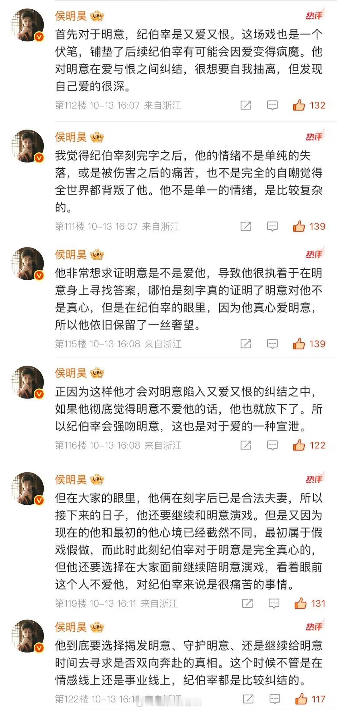 侯明昊为了纪伯宰连回六条评论 救命!怕不是把"纪伯宰"这个角色刻进DNA了吧!连回六条都在分享塑造角色的心得,从角色性格到情感起伏都有独家见解。这么认真的演员也是没谁了,难怪每个眼神都是戏!入青云真是捡到宝了~侯明昊[超话]
