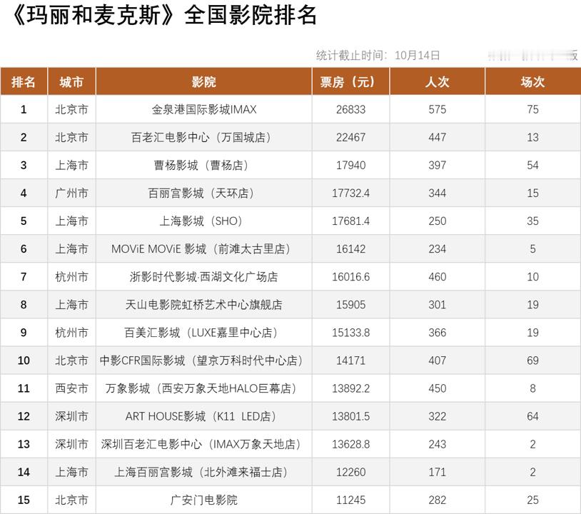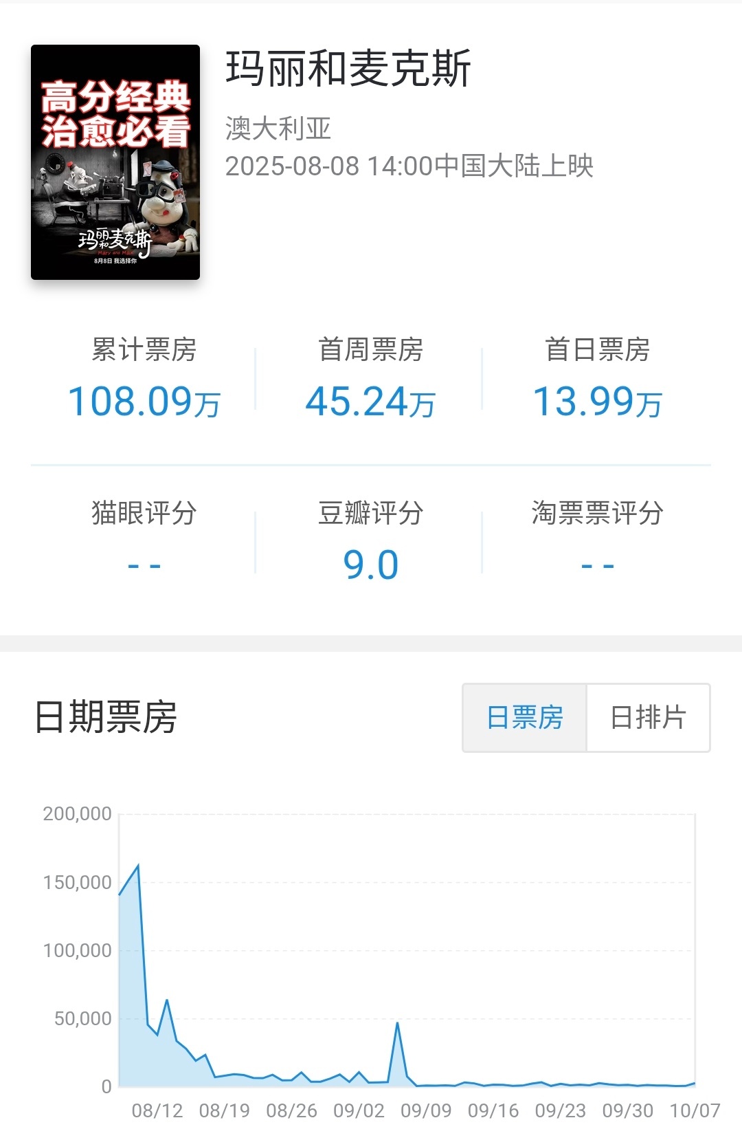 澳大利亚批片玛丽和麦克斯 在内地公映60天下映,分线发行共1472家影院上映,占总数的10.9%,有票房产出影院1168家,总票房108万。