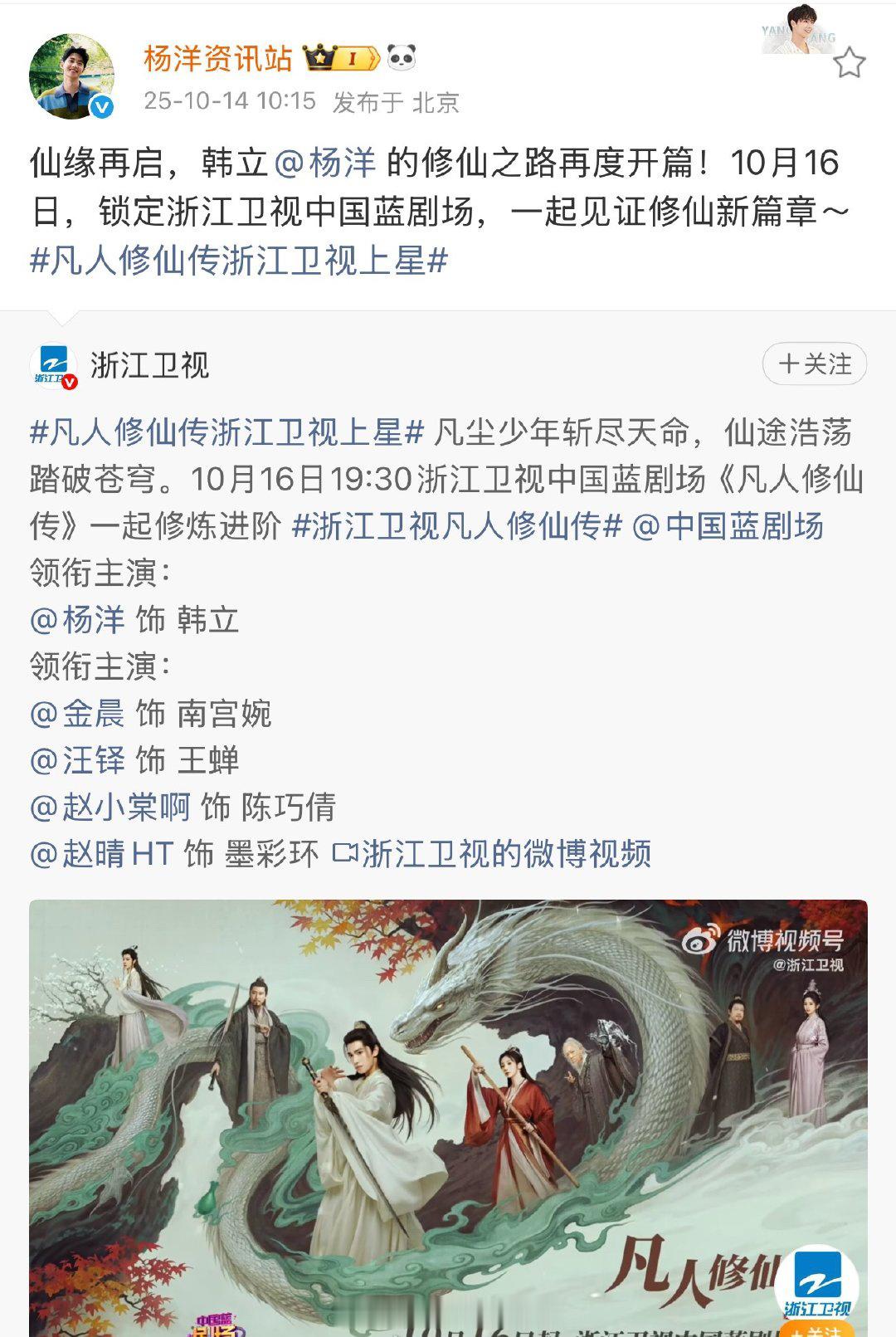 杨洋凡人修仙传上星浙江卫视黄金档,10月16号播出