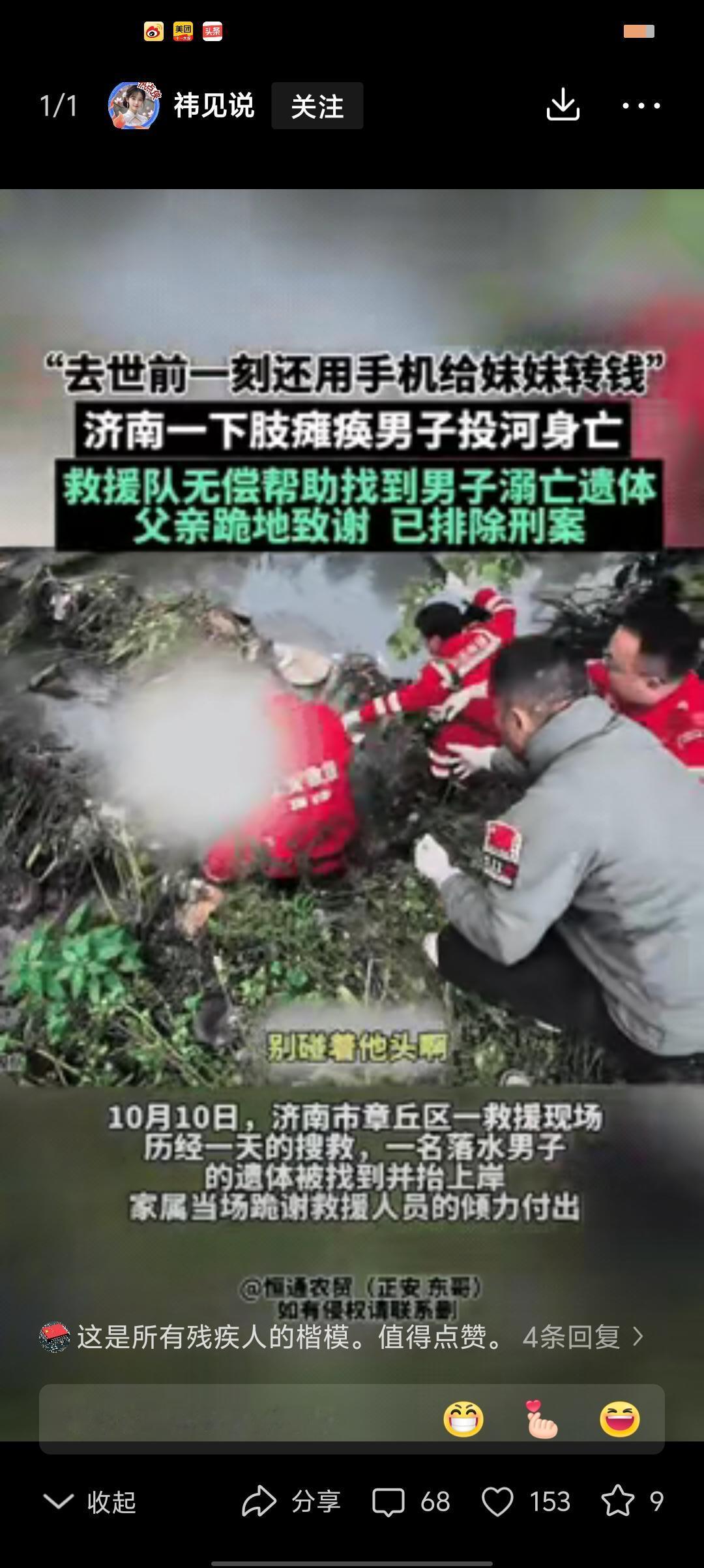济南一男子下肢瘫痪坐轮椅投河自尽投河前将手机里仅有的钱转给了妹妹,将银行卡和手