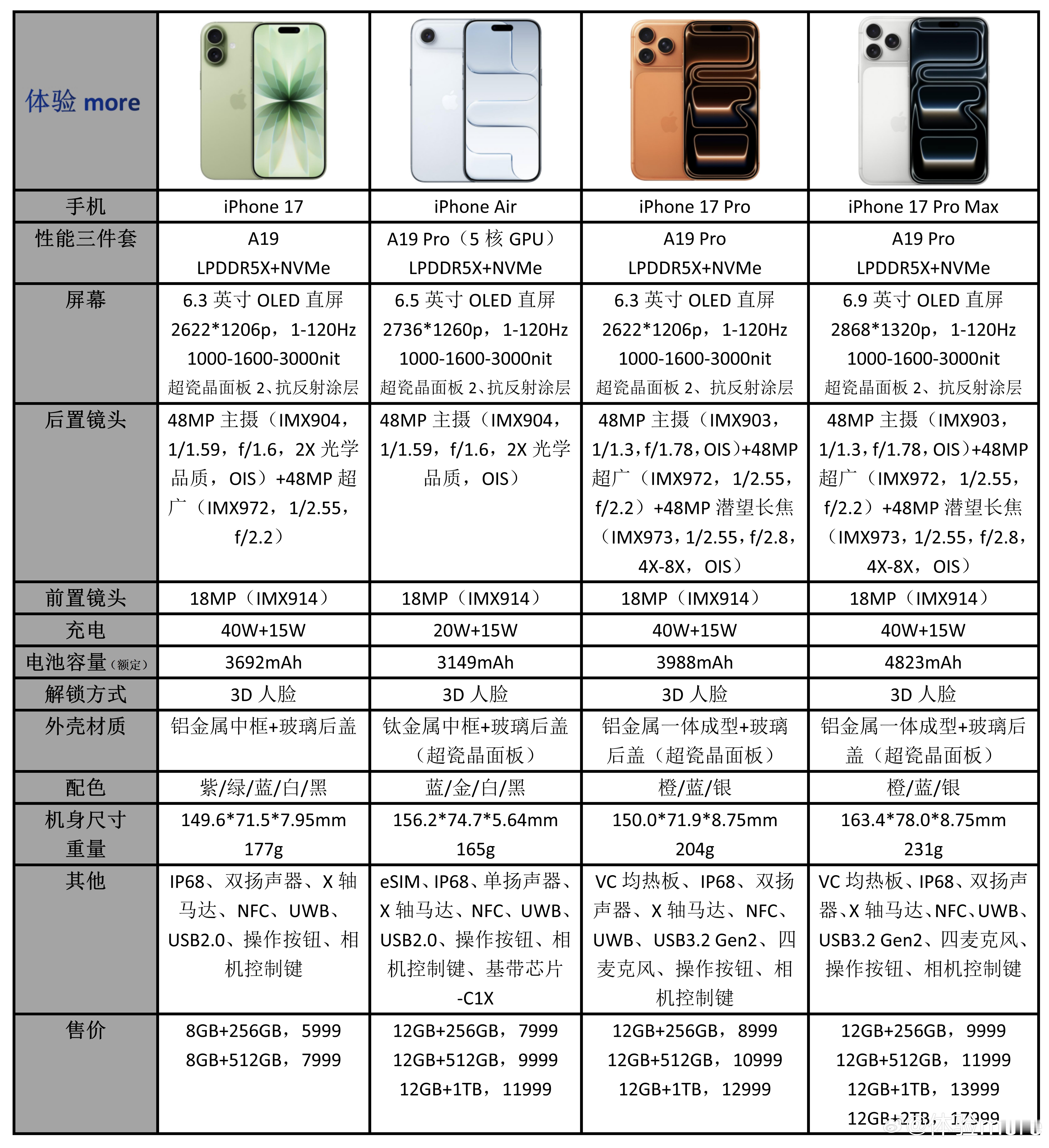 重新看一下iPhone 17系列配置参数价格,增加了镜头规格。