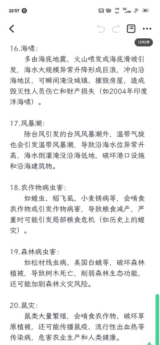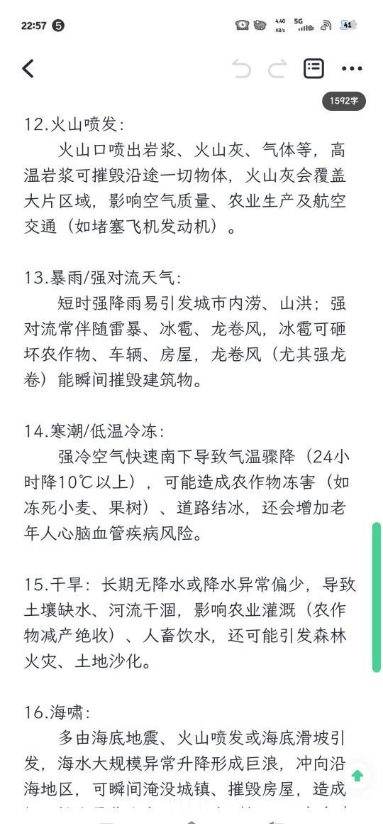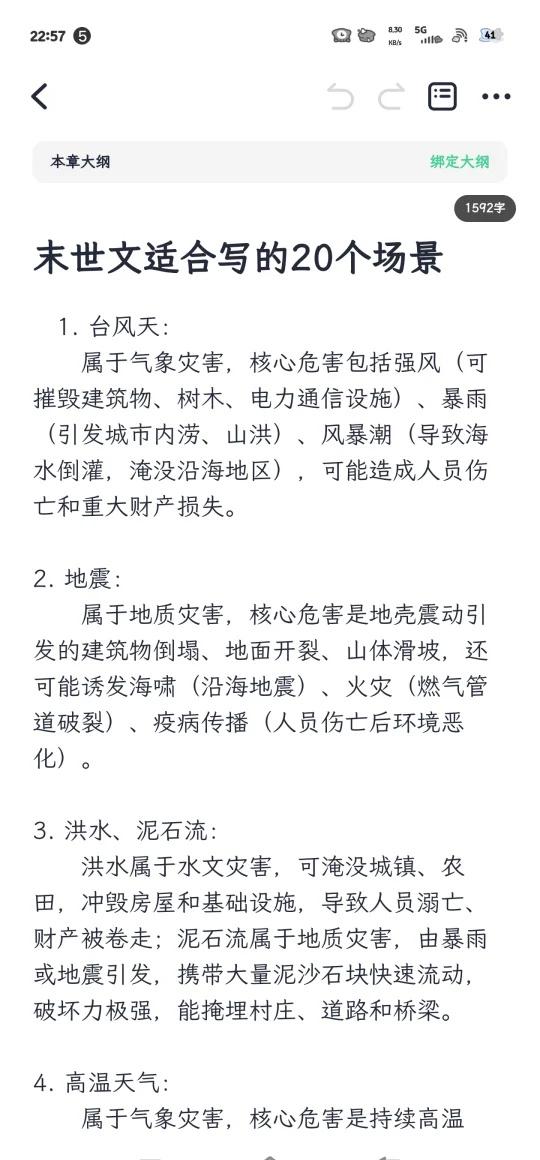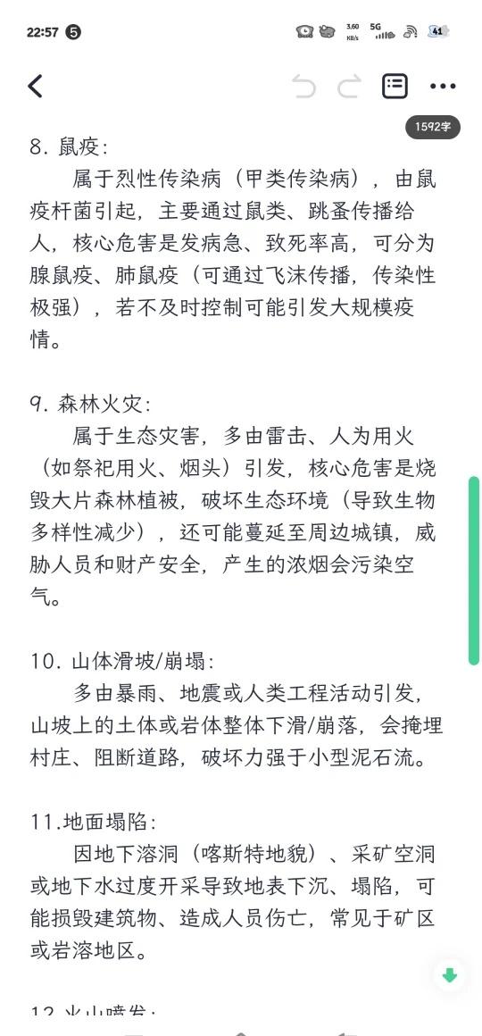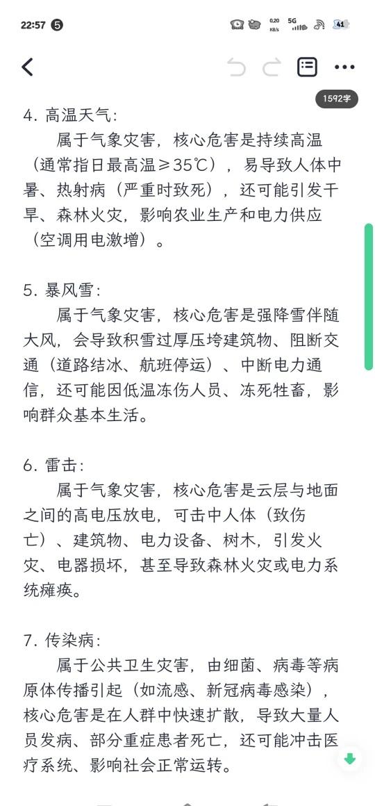 1. 台风天: 属于气象灾害,核心危害包括强风(可摧毁建筑物、树木、电力通信设施)、暴雨(引发城市内涝、山洪)、风暴潮(导致海水倒灌,淹没沿海地区),可能造成人员伤亡和重大财产损失。 2. 地震: 属于地质灾害,核心危害是地壳震动引发的建筑物倒塌、地面开裂、山体滑坡,还可能诱发海啸(沿海地震)、火灾(燃气管道破裂)、疫病传播(人员伤亡后环境恶化)。 3. 洪水、泥石流: 洪水属于水文灾害,可淹没城镇、农田,冲毁房屋和基础设施,导致人员溺亡、财产被卷走;泥石流属于地质灾害,由暴雨或地震引发,携带大量泥沙石块快速流动,破坏力极强,能掩埋村庄、道路和桥梁。 4. 高温天气: 属于气象灾害,核心危害是持续高温(通常指日最高温≥35℃),易导致人体中暑、热射病(严重时致死),还可能引发干旱、森林火灾,影响农业生产和电力供应(空调用电激增)。 5. 暴风雪: 属于气象灾害,核心危害是强降雪伴随大风,会导致积雪过厚压垮建筑物、阻断交通(道路结冰、航班停运)、中断电力通信,还可能因低温冻伤人员、冻死牲畜,影响群众基本生活。 6. 雷击: 属于气象灾害,核心危害是云层与地面之间的高电压放电,可击中人体(致伤亡)、建筑物、电力设备、树木,引发火灾、电器损坏,甚至导致森林火灾或电力系统瘫痪。 7. 传染病: 属于公共卫生灾害,由细菌、病毒等病原体传播引起(如流感、新冠病毒感染),核心危害是在人群中快速扩散,导致大量人员发病、部分重症患者死亡,还可能冲击医疗系统、影响社会正常运转。 8. 鼠疫: 属于烈性传染病(甲类传染病),由鼠疫杆菌引起,主要通过鼠类、跳蚤传播给人,核心危害是发病急、致死率高,可分为腺鼠疫、肺鼠疫(可通过飞沫传播,传染性极强),若不及时控制可能引发大规模疫情。 9. 森林火灾: 属于生态灾害,多由雷击、人为用火(如祭祀用火、烟头)引发,核心危害是烧毁大片森林植被,破坏生态环境(导致生物多样性减少),还可能蔓延至周边城镇,威胁人员和财产安全,产生的浓烟会污染空气。 10. 山体滑坡/崩塌: 11.地面塌陷: 12.火山喷发: 13.暴雨/强对流天气: 14.寒潮/低温冷冻: 15.干旱: 16.海啸: 17.风暴潮: 18.农作物病虫害: 19.森林病虫害: 20.鼠灾: 小说 素材积累 网文