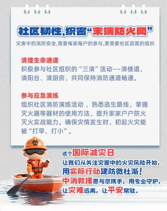 国际减灾日 第36个国际减灾日 📌 年度主题: 【投资韧性建设,提升防灾减灾能力】 自然灾害 来袭时 我们首先想到的可能是地震 洪水 极端天气 等自然灾害对人类人身财产安全的波及 但有一种隐藏危险 🔥破坏力甚至超过原生灾害, 它往往以 “二次打击” 的形式出现—— ⚠ 它就是「次生火灾」。 中消救援 郑重提醒: 提升全社会灾害韧性, 必须将“次生火灾防范” 贯穿防灾减灾救灾全过程。 防范于未燃!
