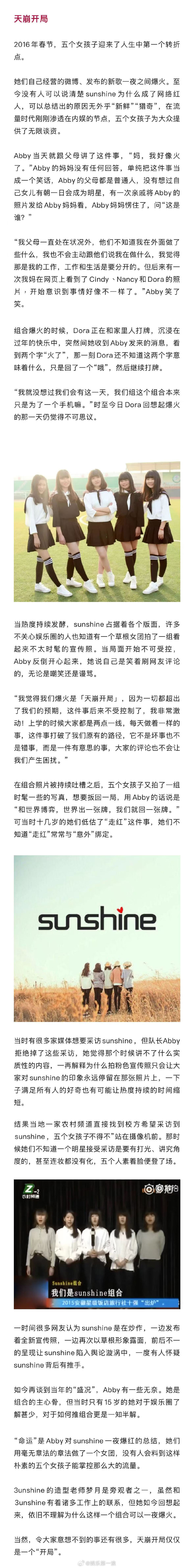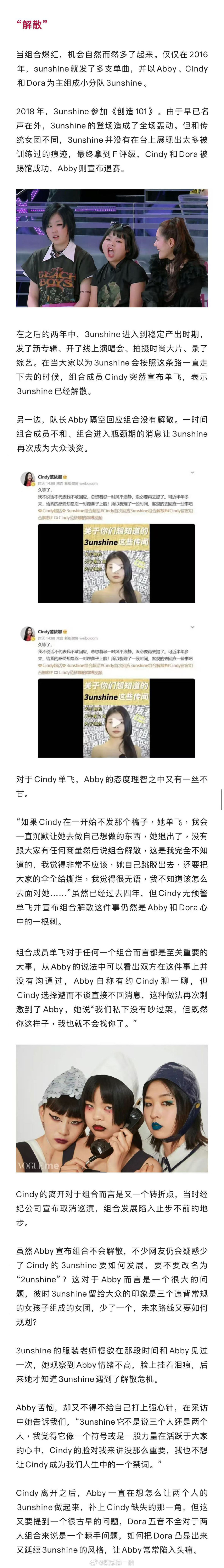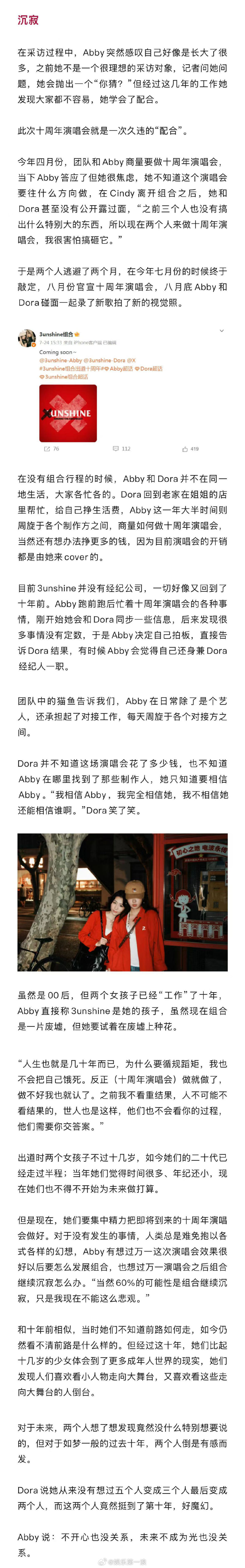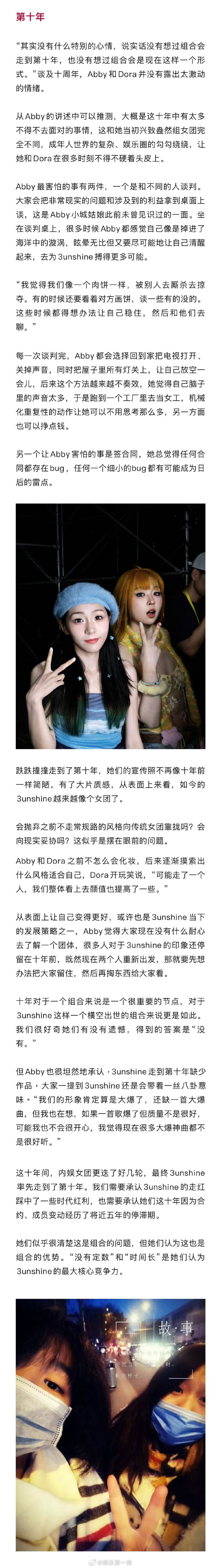3unshine回应解散危机 3unshine说组合缺一首大爆曲 接受新浪娱乐专访,表示从未想过组合会走到第十年。在这十年里,她们经历了出道时的迷茫、没钱时的窘迫、成员无预警单飞的危机,这几年两人组的3unshine进入到组合停滞期,如何重新运作组合是现阶段的大问题。